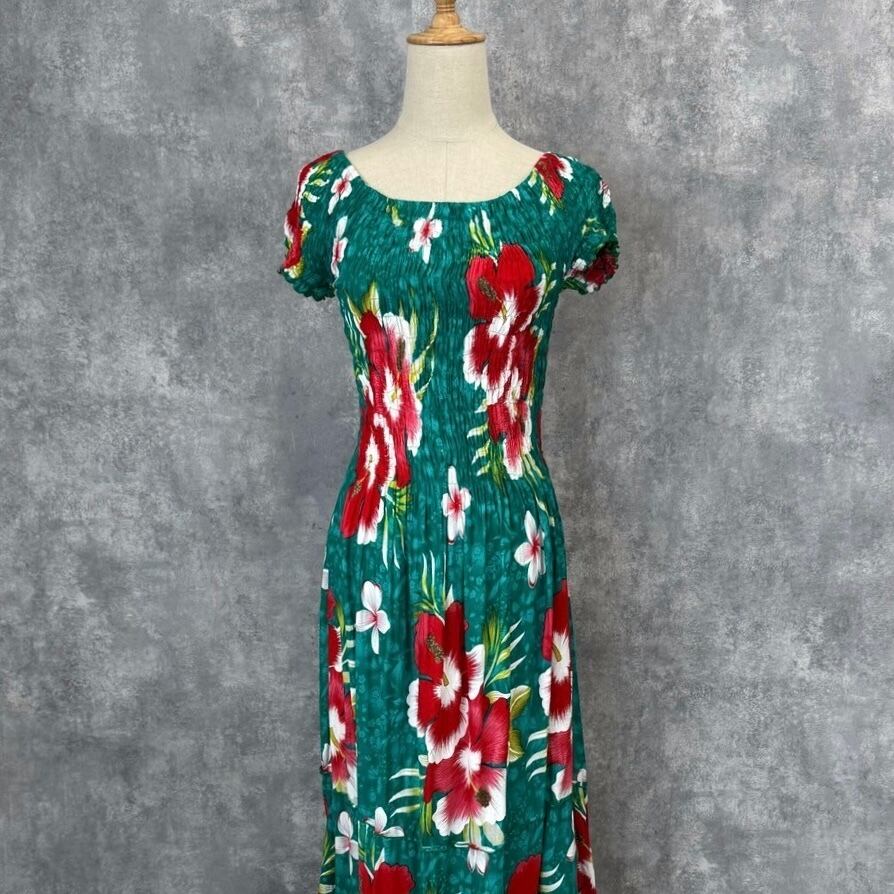 鮮やかな赤色のハイビスカス柄がグリーンの生地に映えるハワイアンワンピース。
