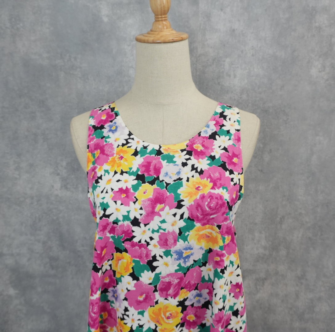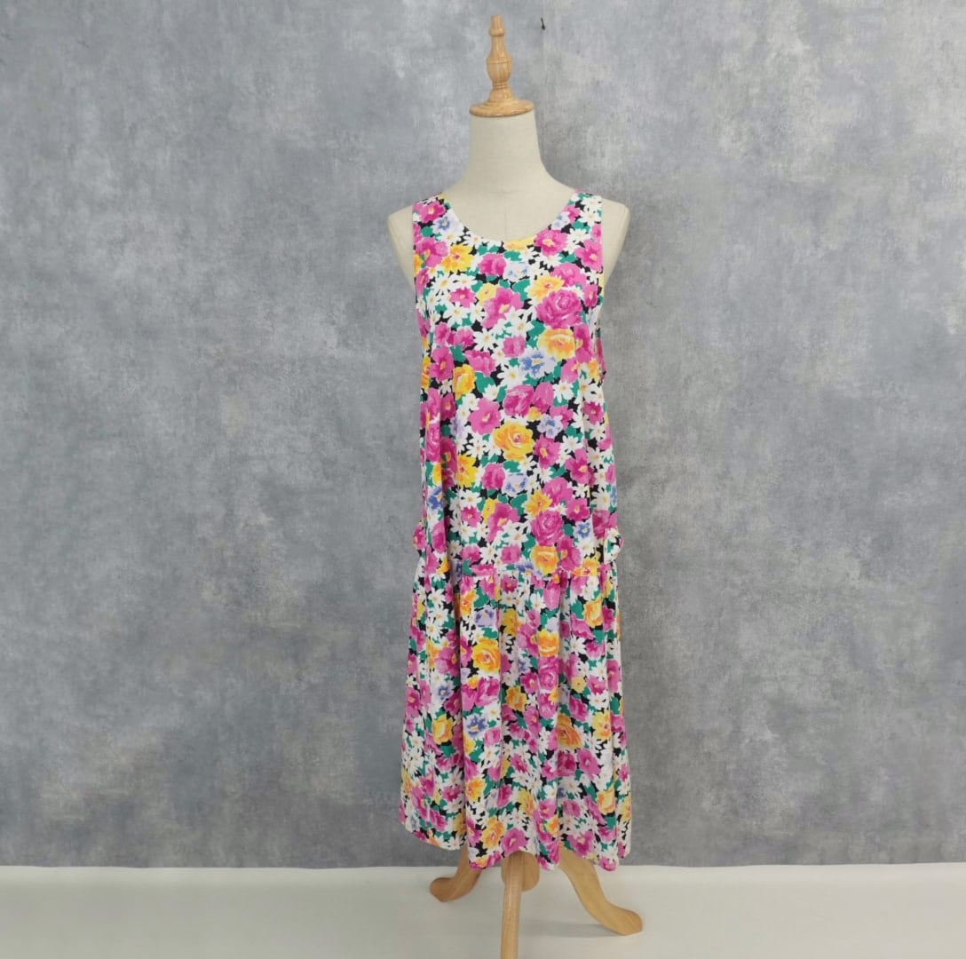 まるでお花畑のような華やかなデザインのスリーブレスワンピース。