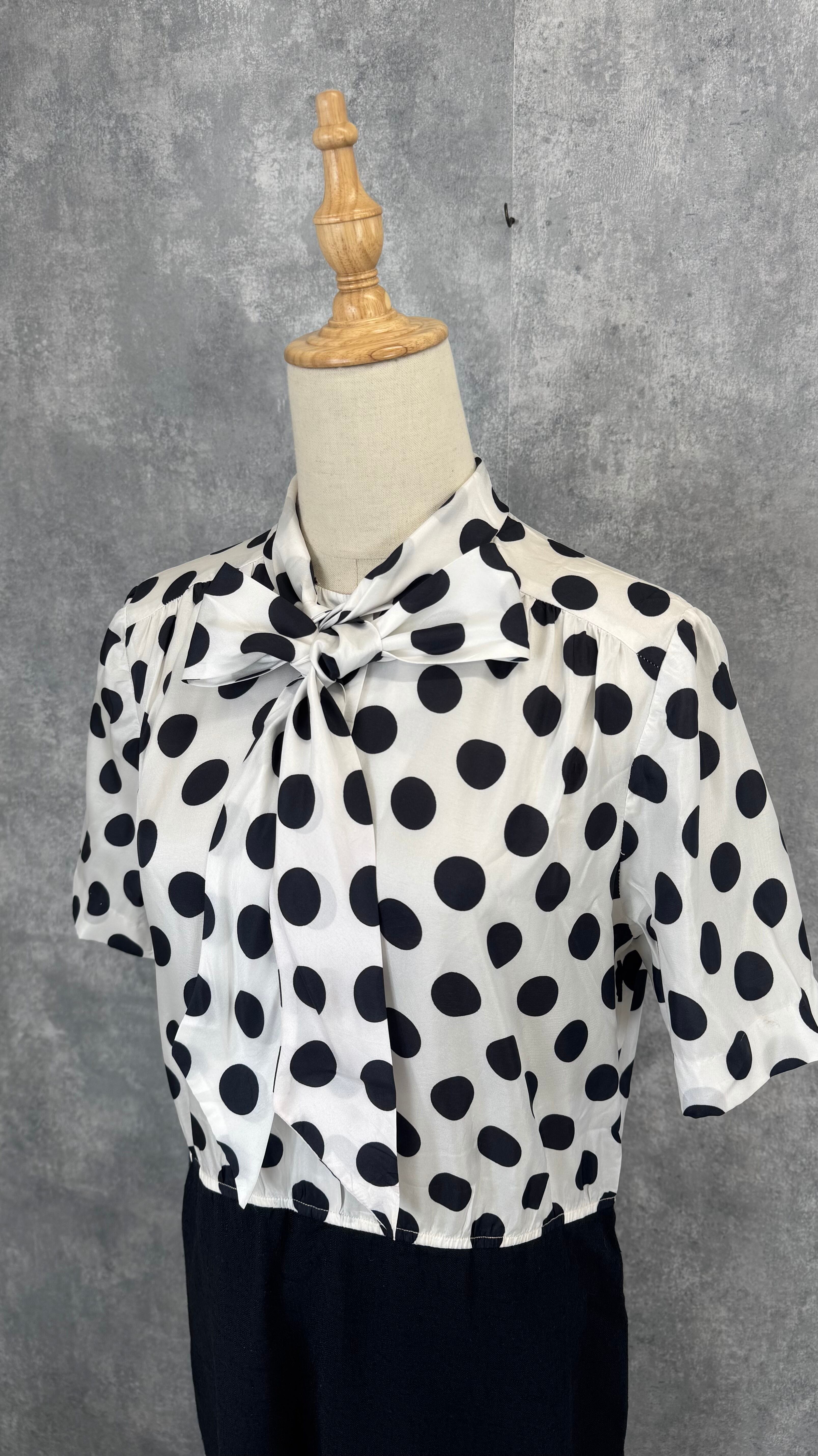 ドット模様のブラウスとリボンタイが特徴的なワンピース。
