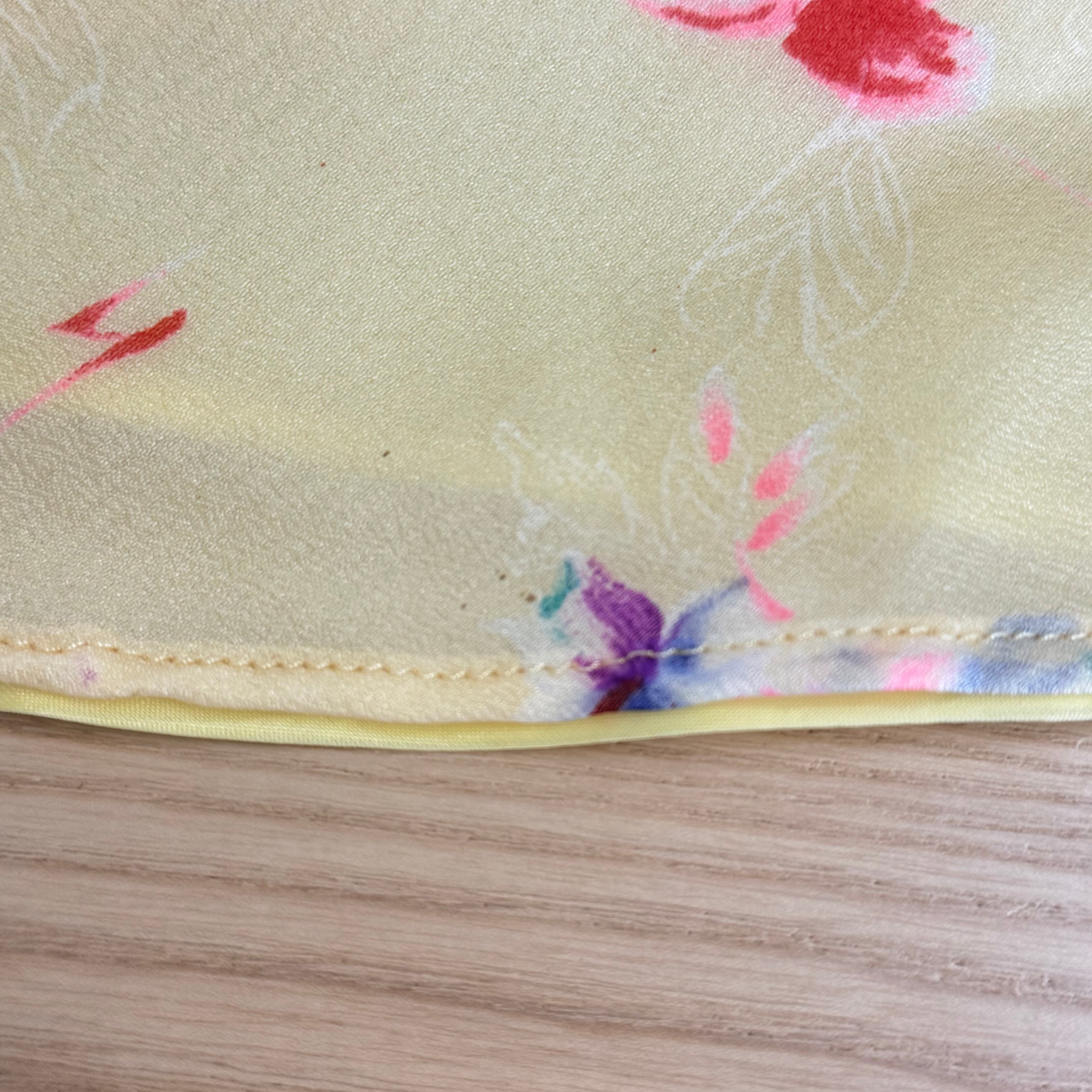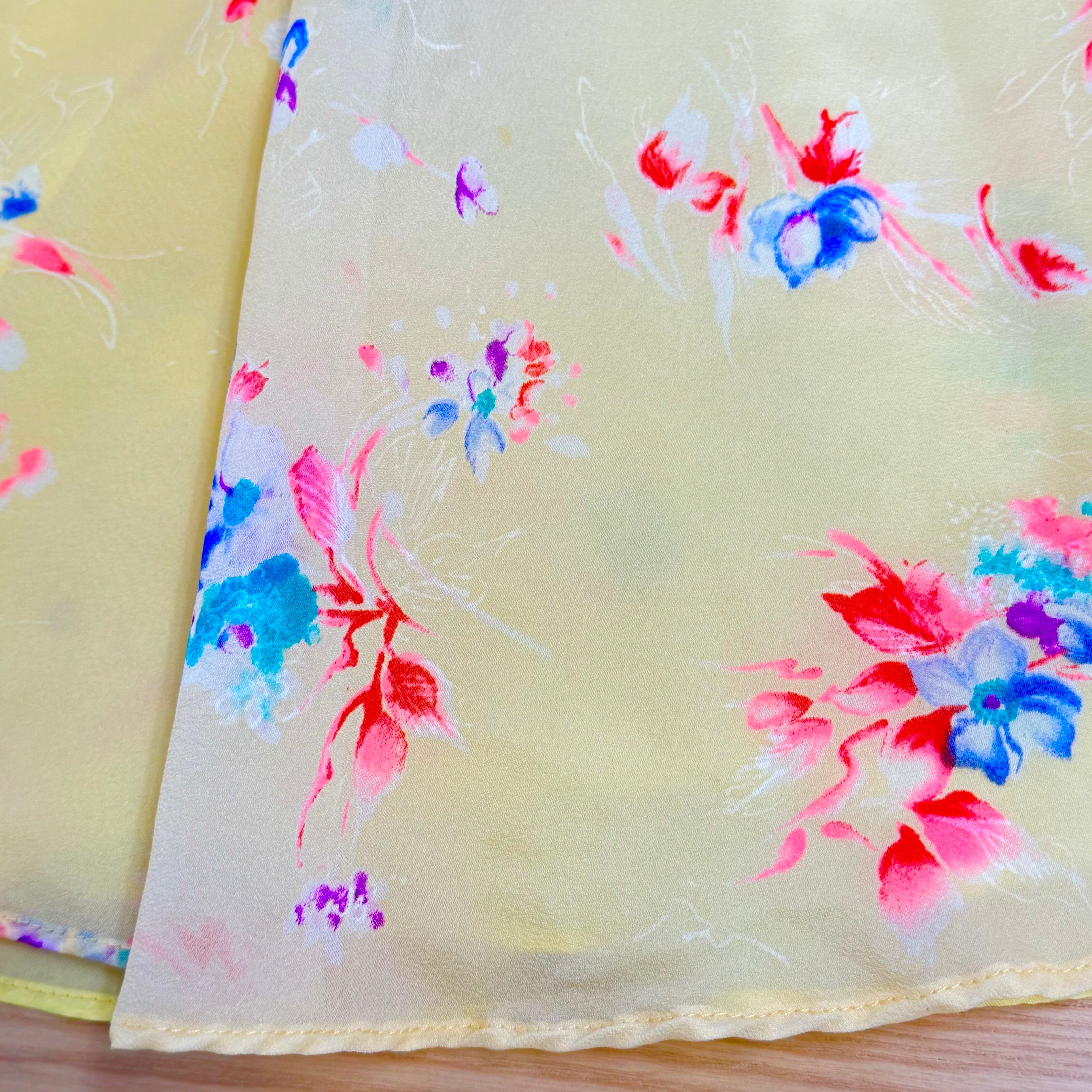 やわらかなクリームイエローに、繊細な小花柄が散りばめられたフェミニンな一着。