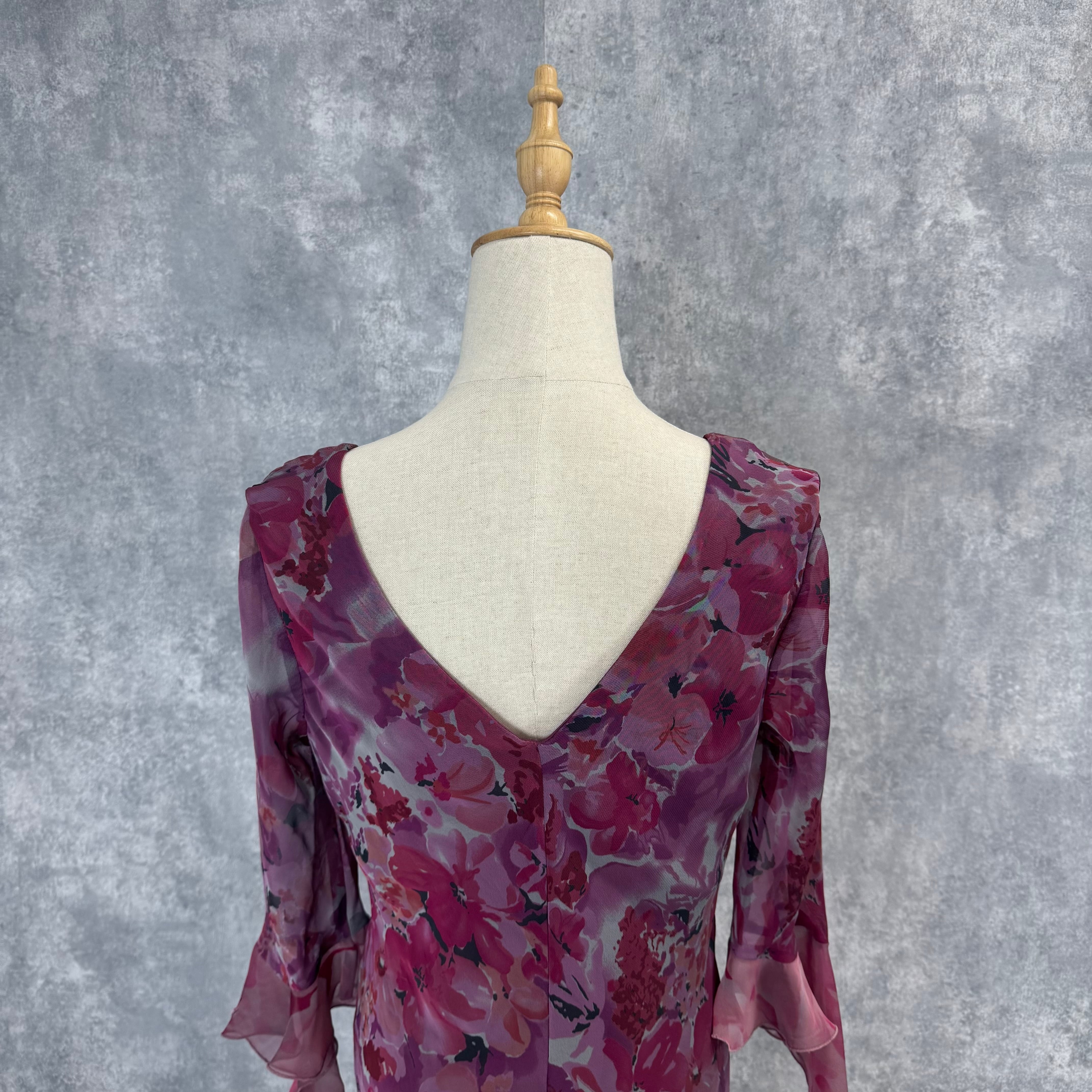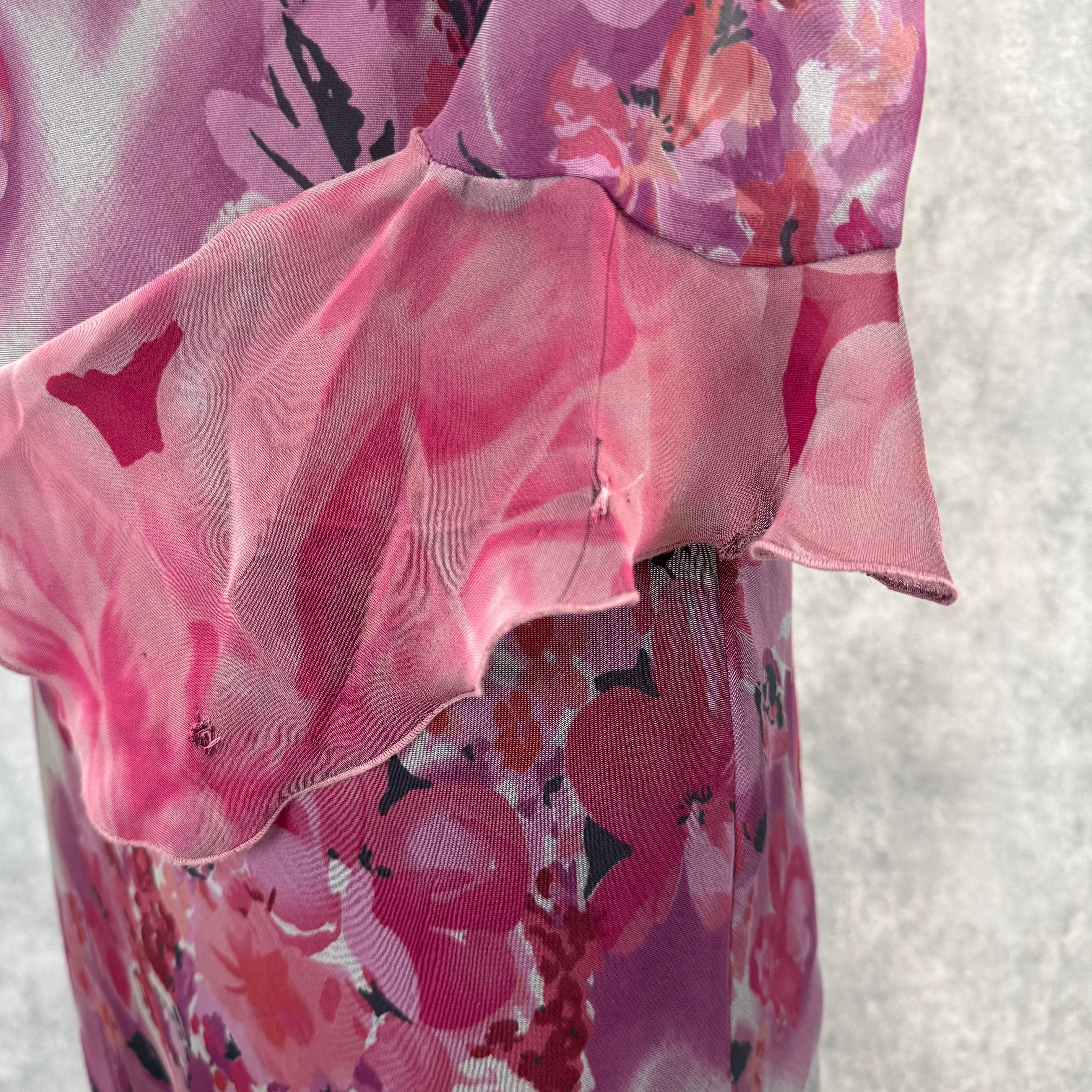 華やかなピンク〜パープル系のフラワープリントが映える一着。