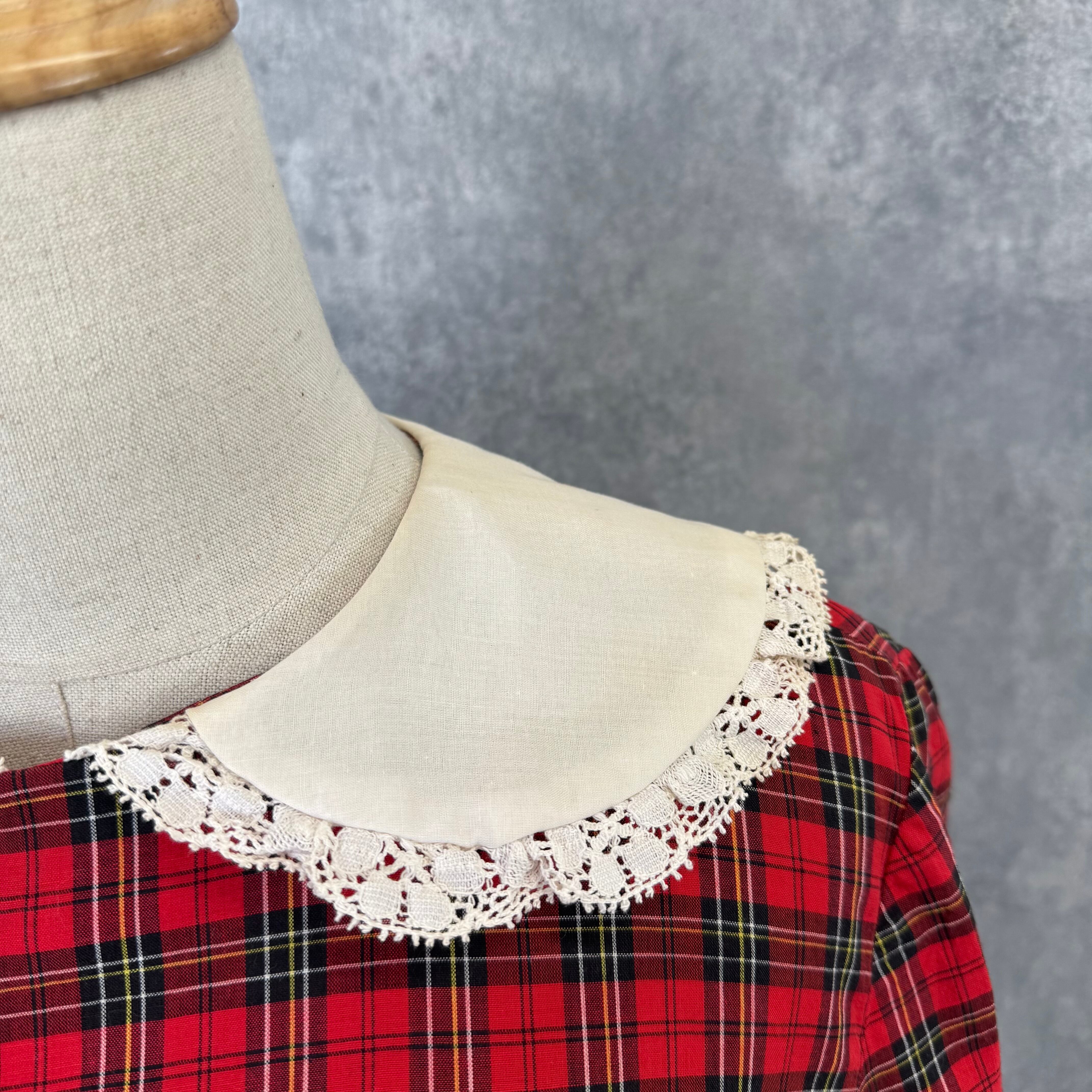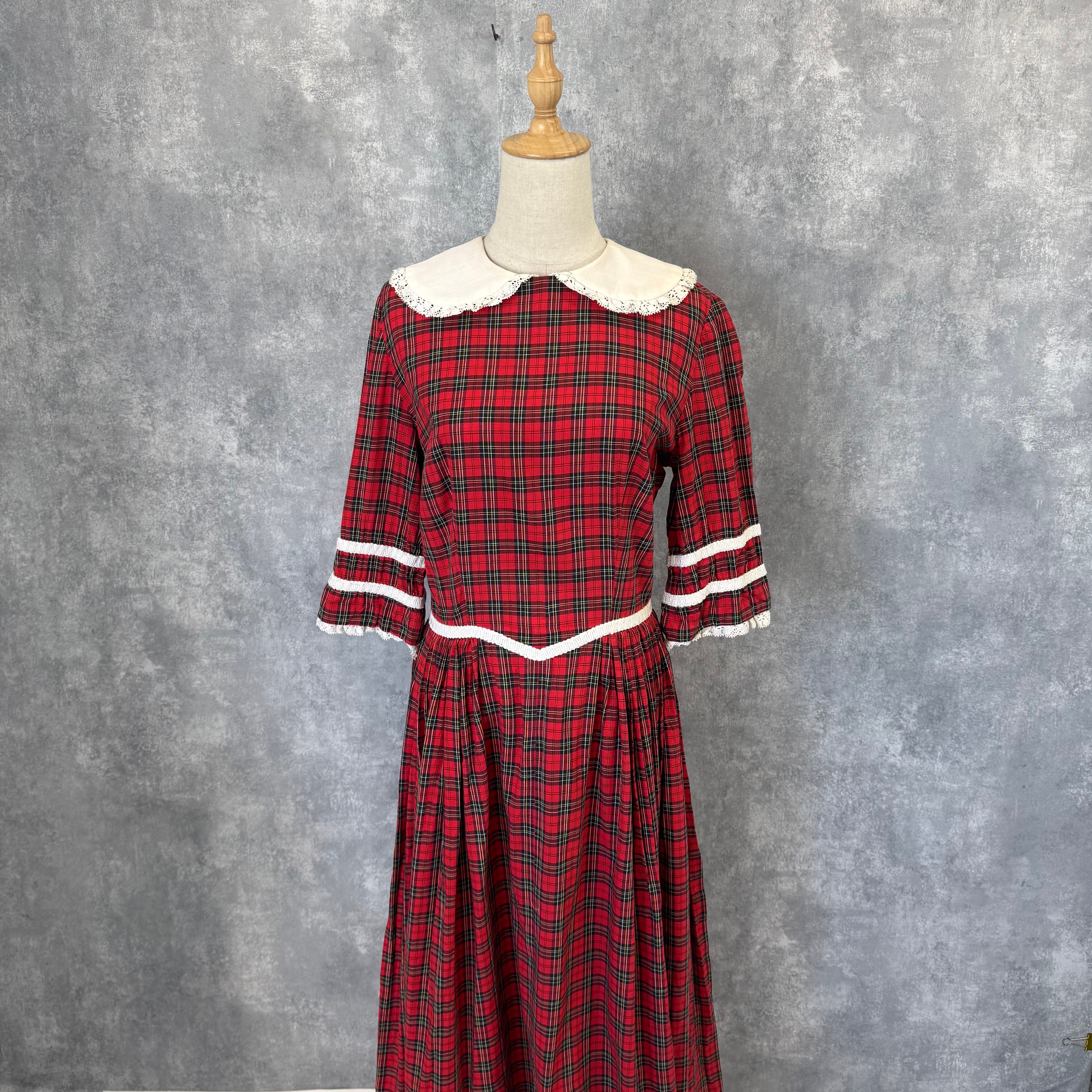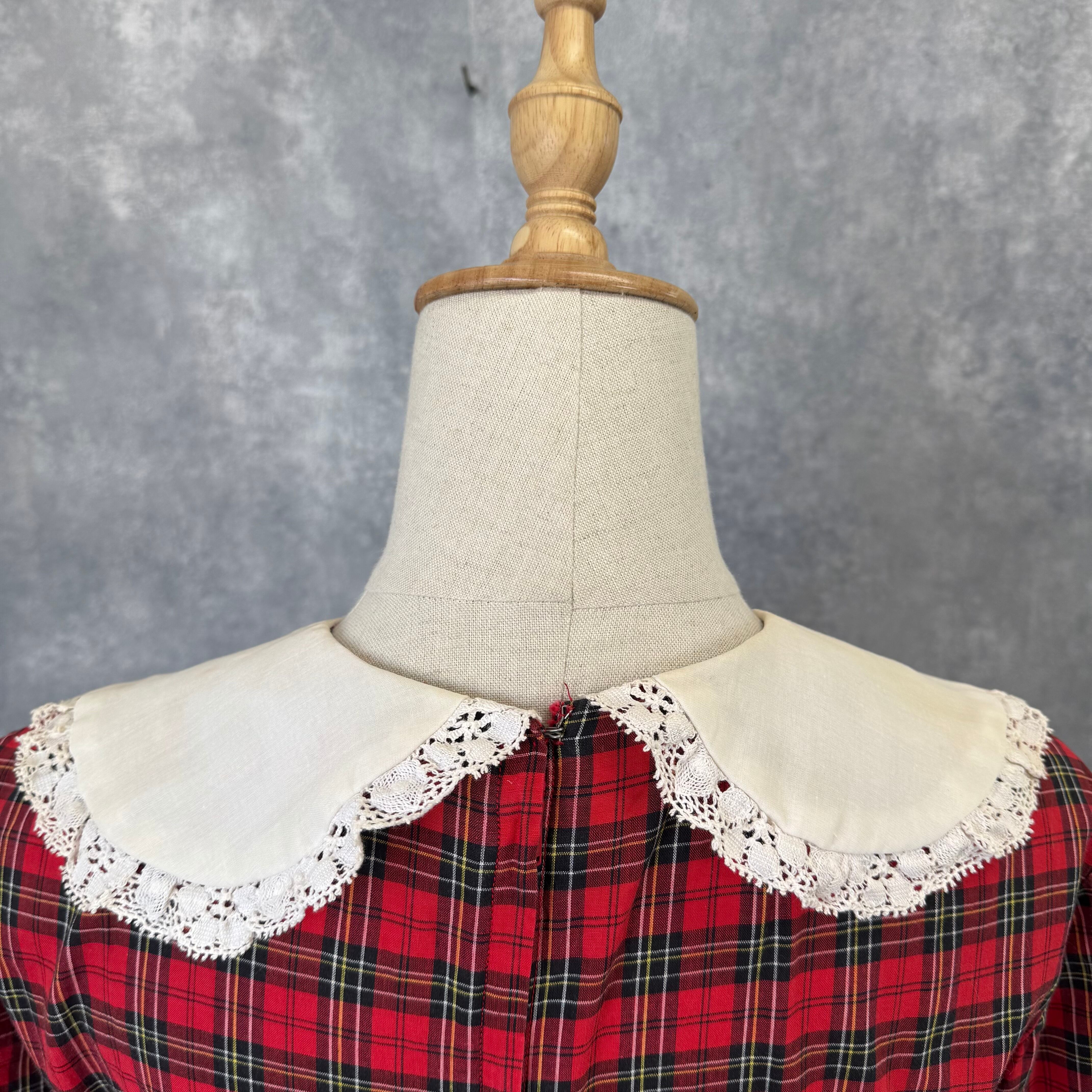 レッドタータンチェック柄ワンピース 丸襟デザイン フレアシルエット