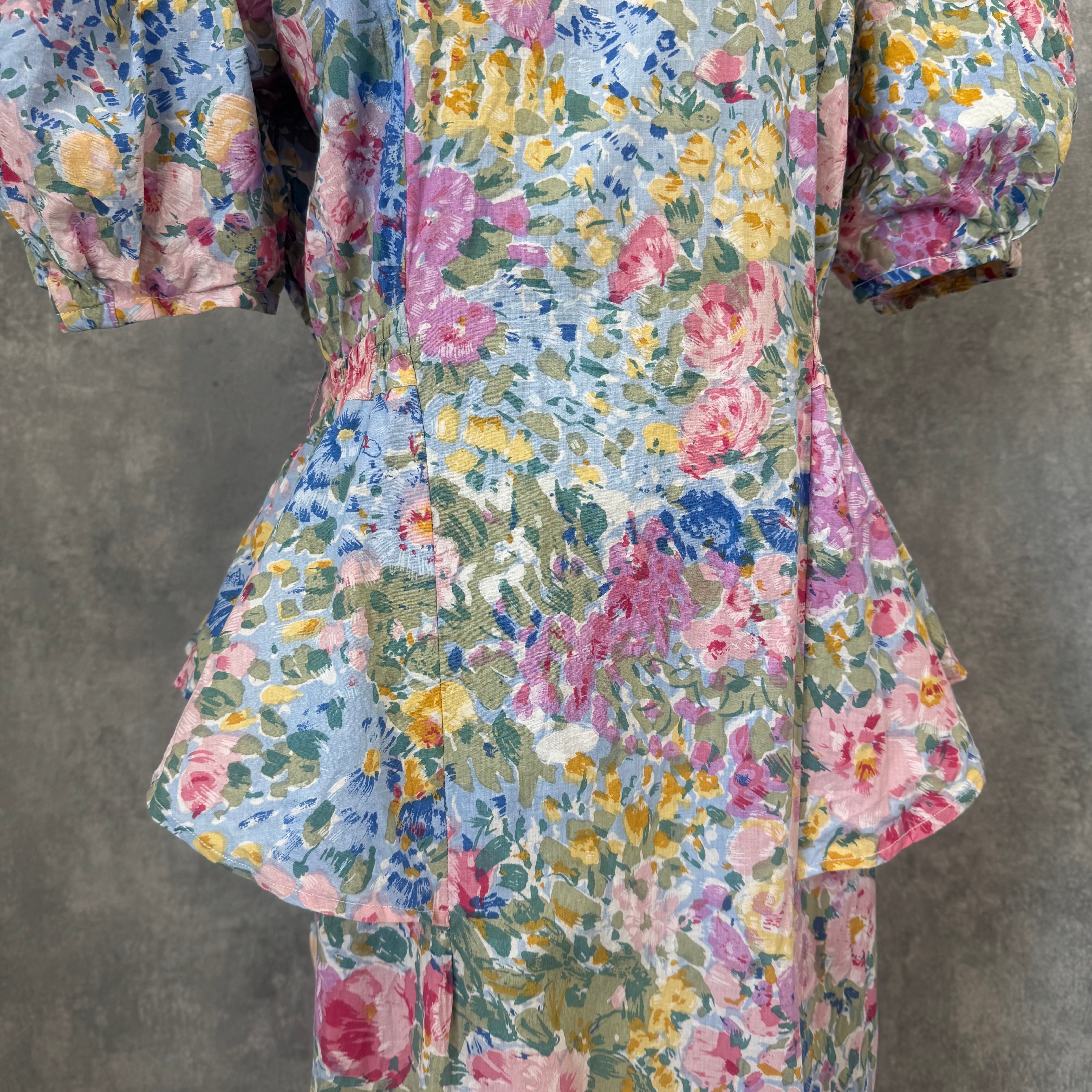 フローラルプリントワンピース ペプラムシルエット パフスリーブ