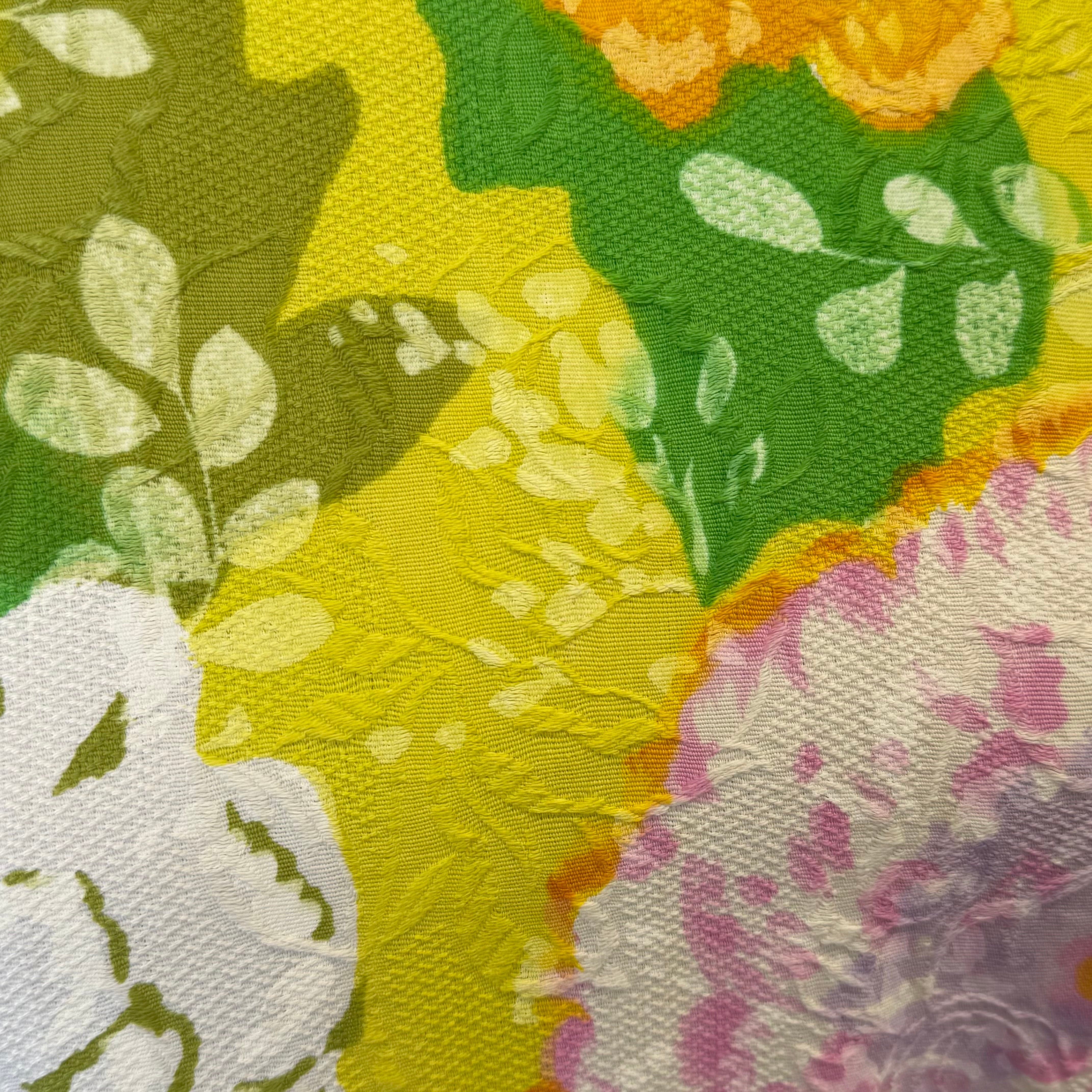 鮮やかなイエローやグリーンを基調に大輪の花々が咲き誇るフラワープリントが目を引くワンピース。