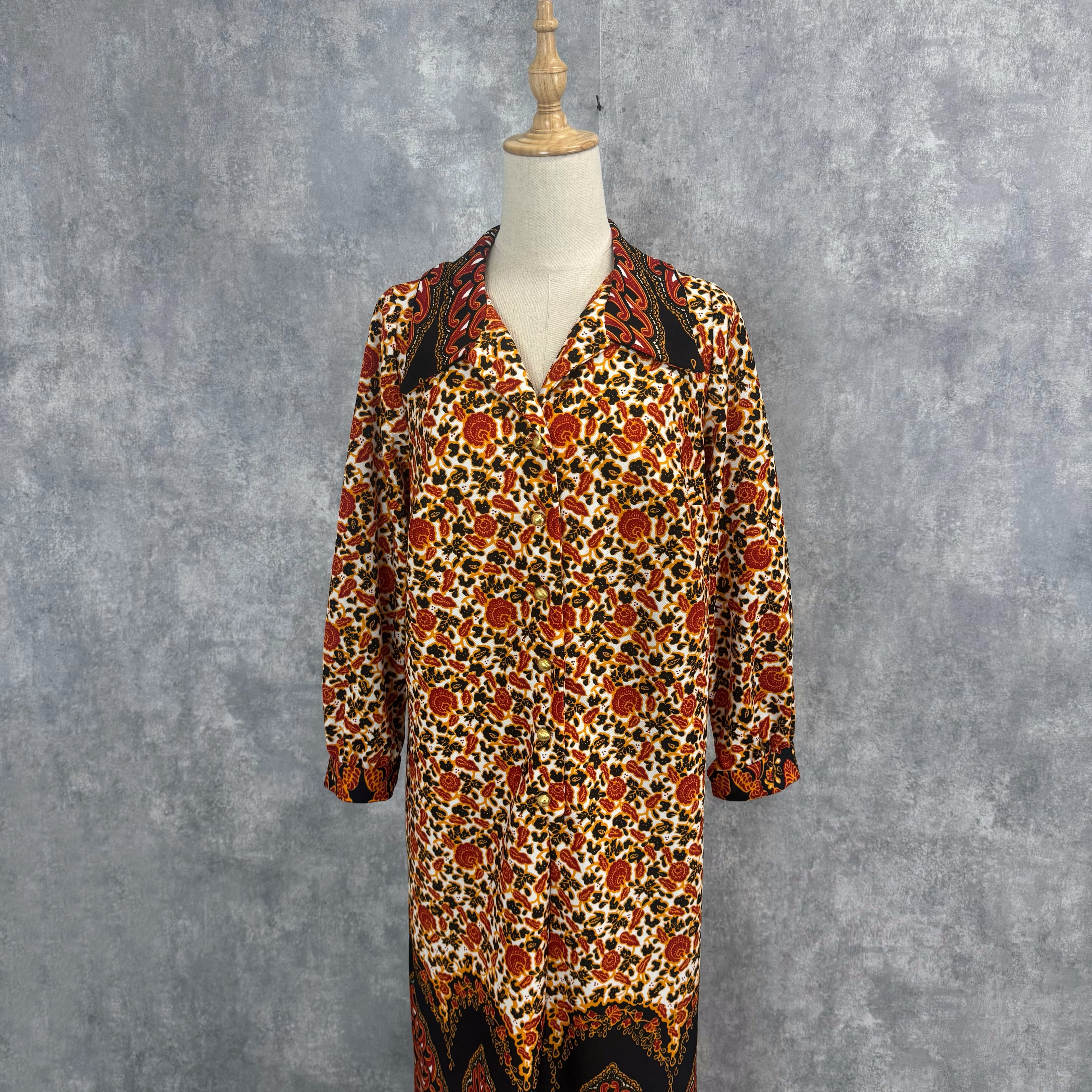 エスニックな雰囲気漂うレトロな総柄ロングワンピース。