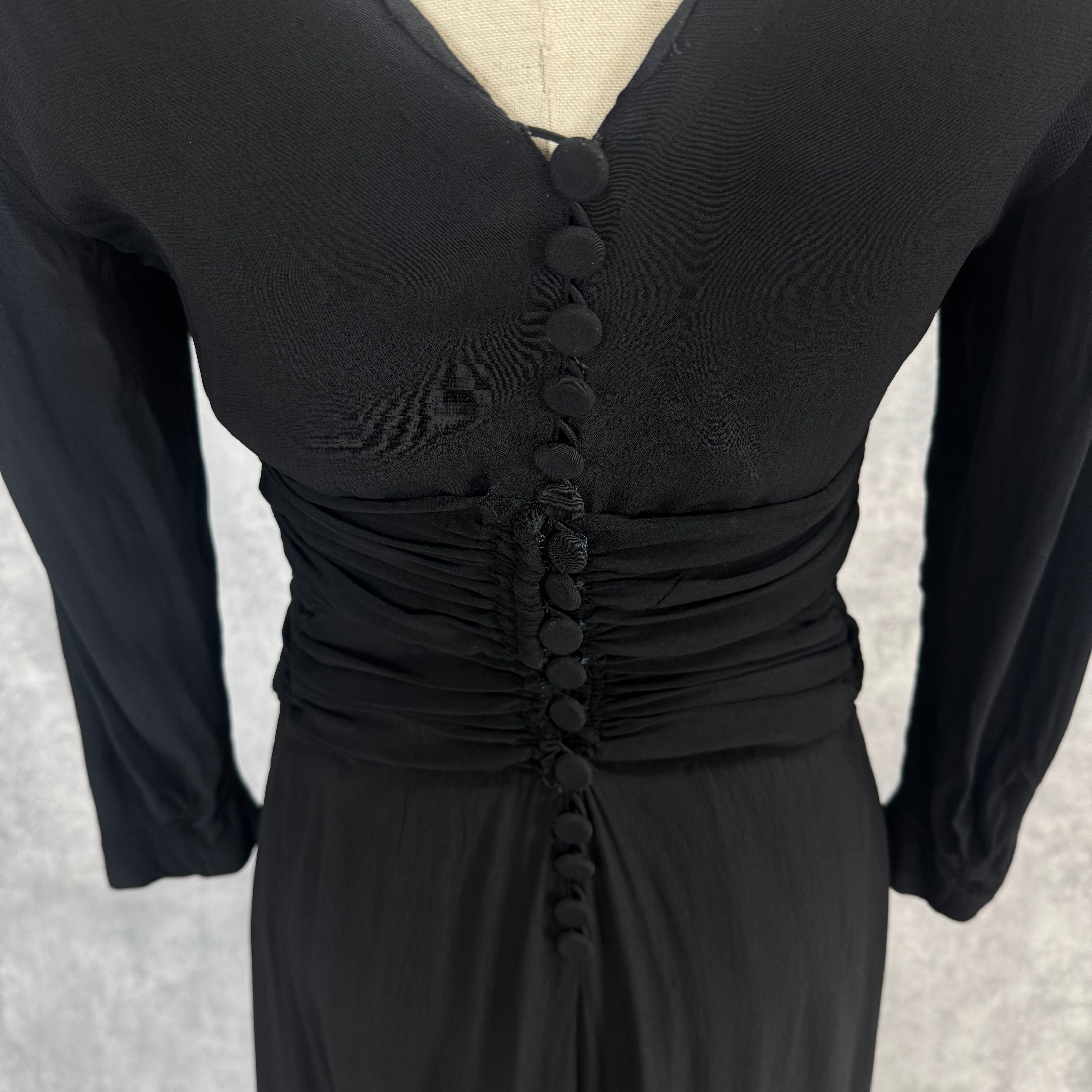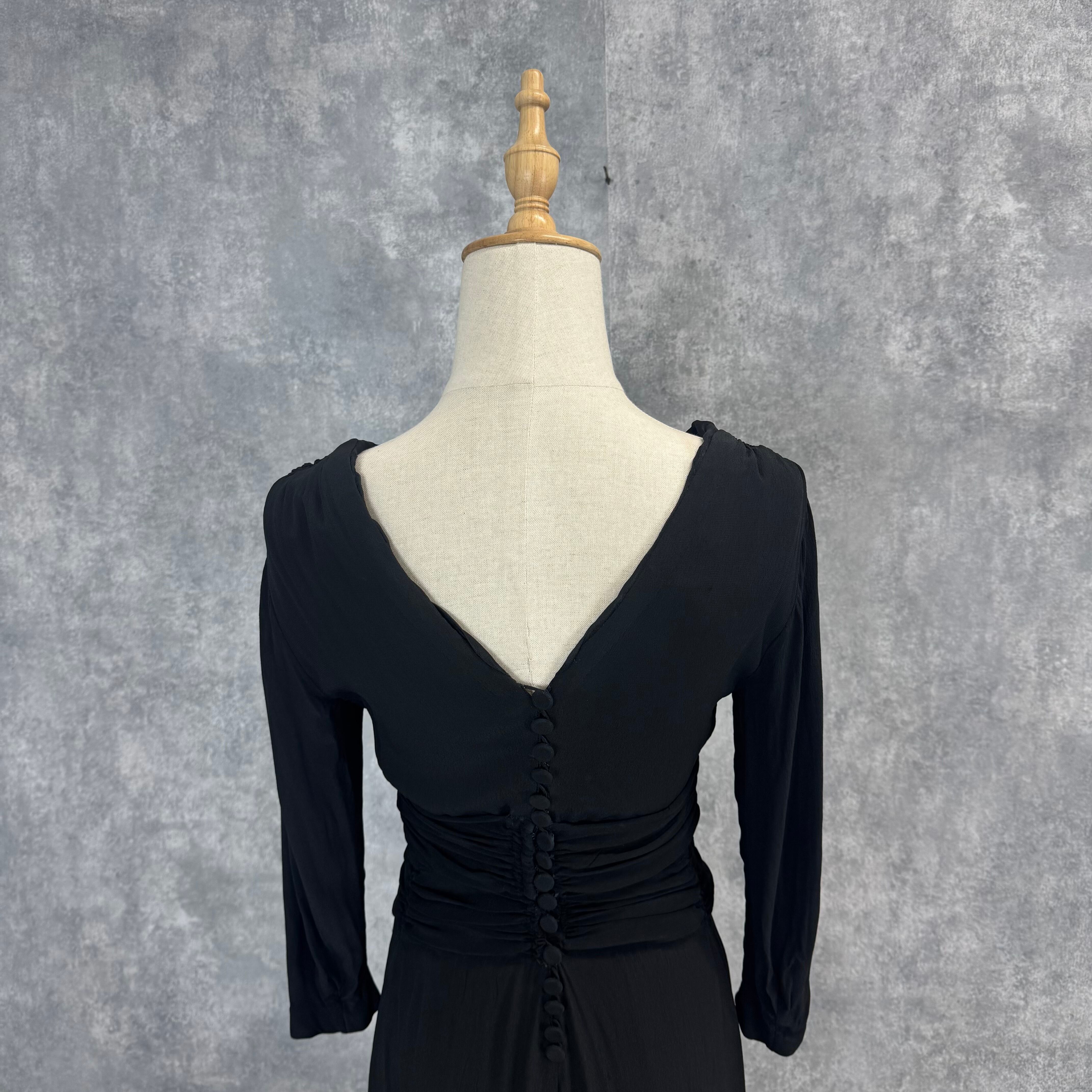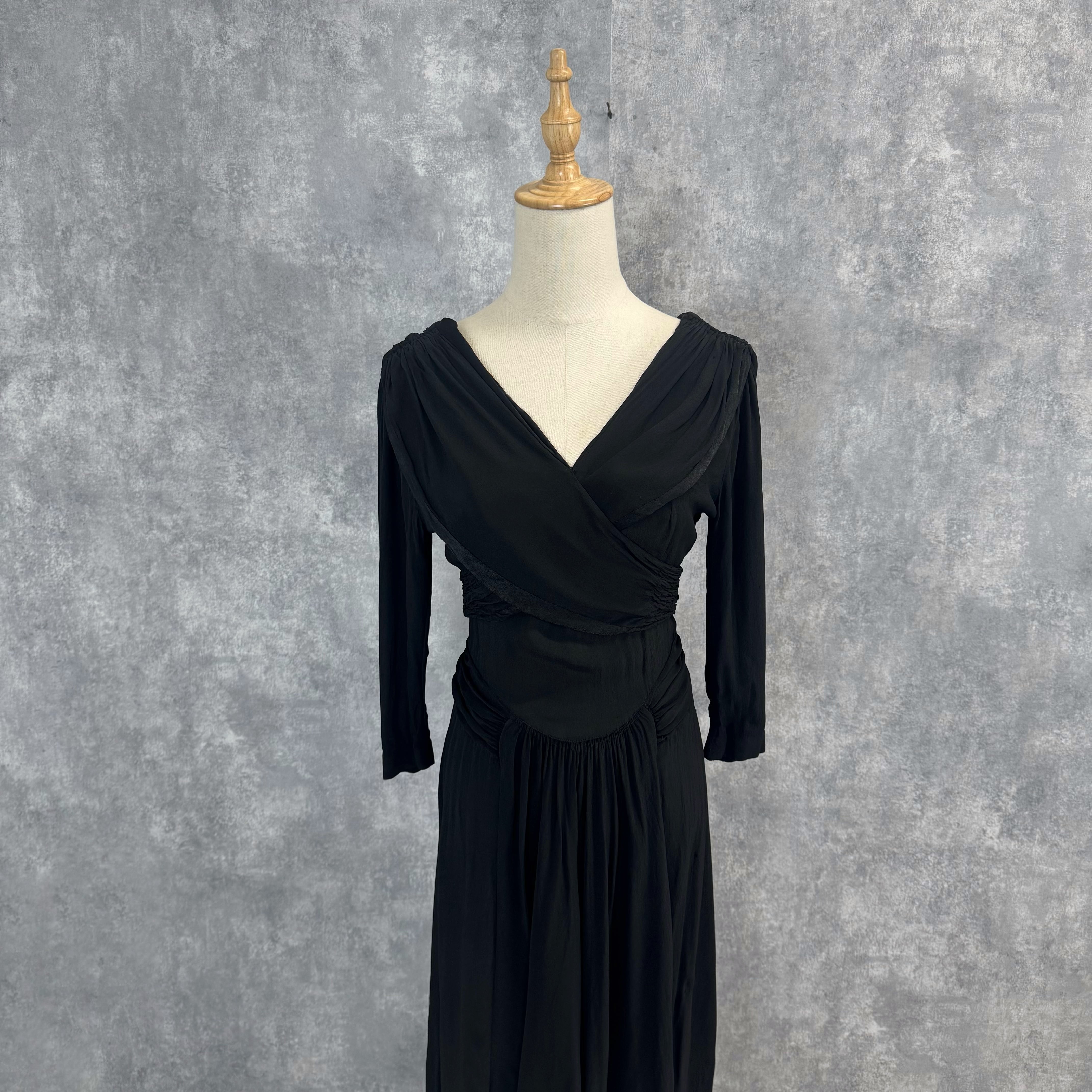 落ち着いたブラックのワントーンながらディテールで魅せるヴィンテージらしい一着。特別な日のお出かけや、クラシカルに装いたいシーンにもぴったりです。