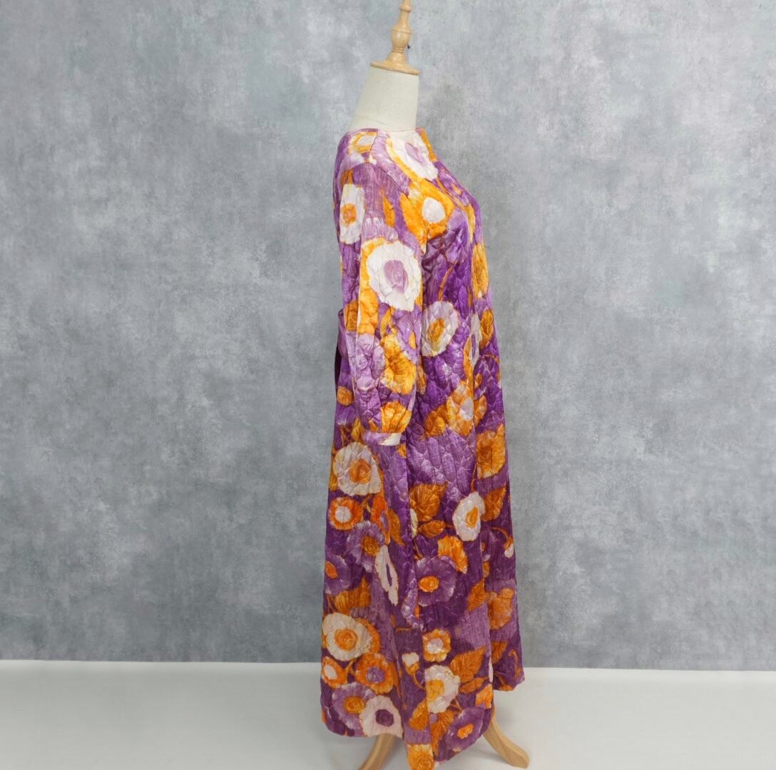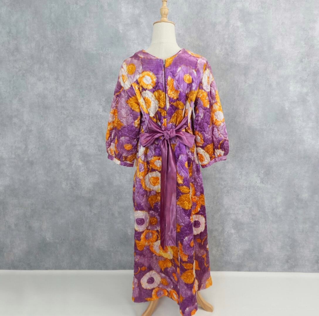パープル×イエローの華やかなフラワープリントが目を惹く、70年代ヴィンテージのキルティングワンピース。