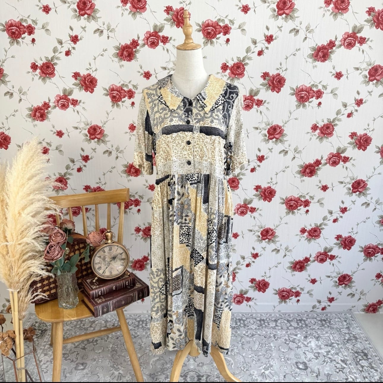 パッチワーク柄シャツワンピース/モノトーン×ベージュ/半袖ロングワンピース/レトロヴィンテージスタイル/ゆったりシルエット/総柄レーヨン調ワンピース/春夏秋/モネリトル(3500円)