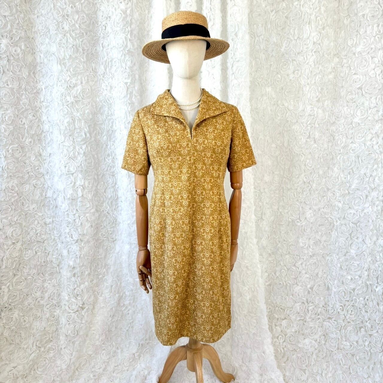 ヴィンテージ 花柄ジャガードワンピース マスタードカラー 半袖 開襟 襟付き レトロ クラシカル 上品シルエット 膝丈 昭和レトロ 古着ワンピース(4600円)