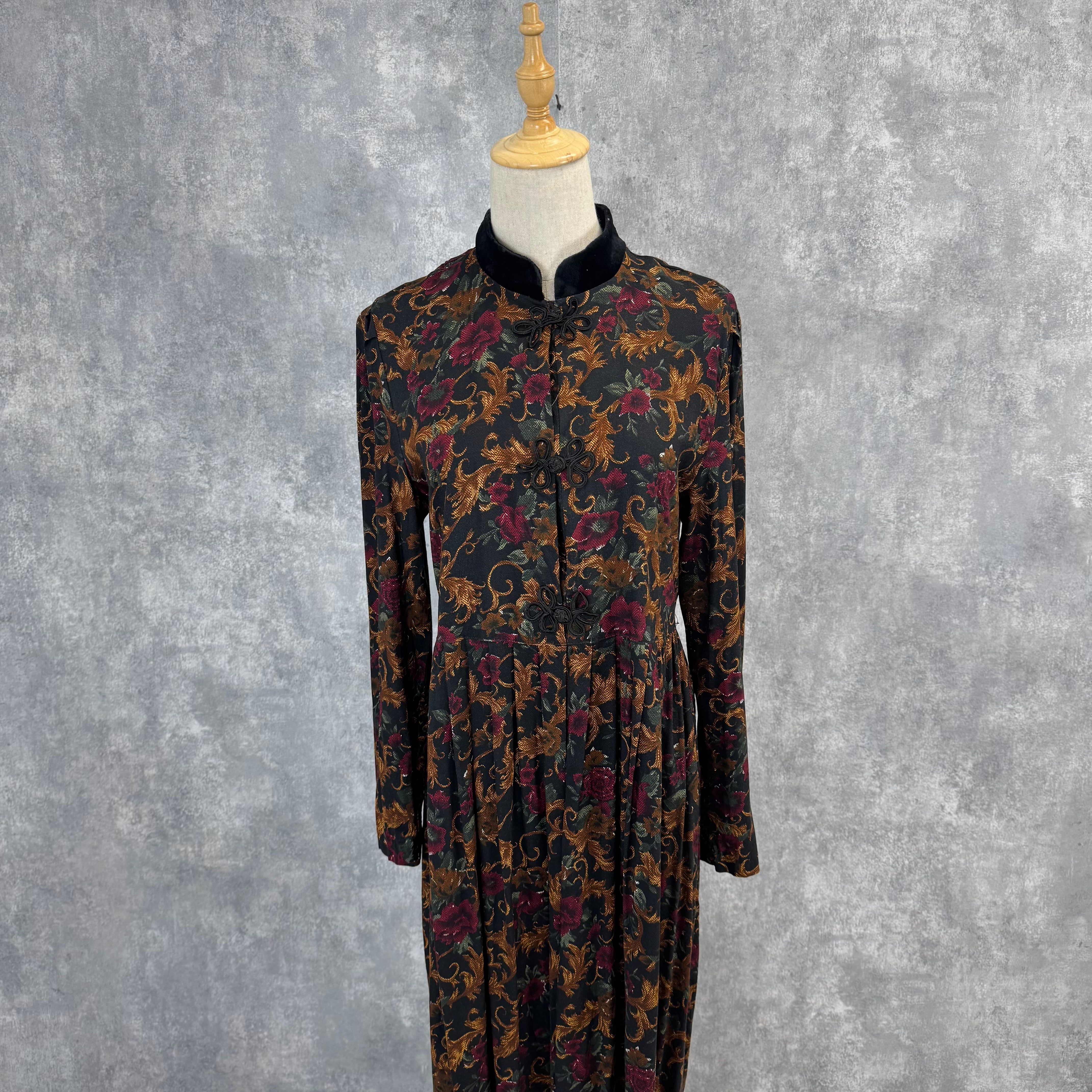 重厚な華やかさ漂う チャイナボタン装飾のクラシカルフラワー柄 チャイナ風ワンピース
