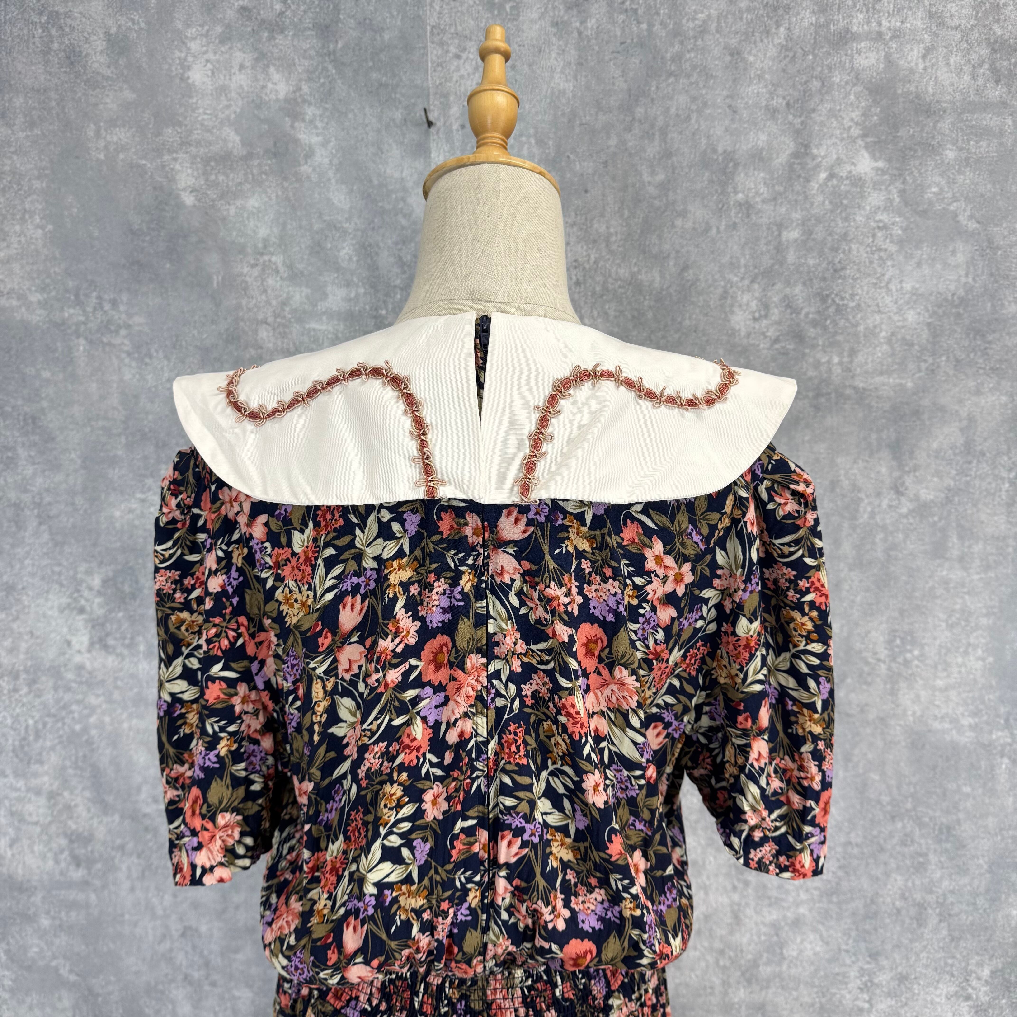 ネイビーベースに咲き誇るフラワープリントは、ピンク・パープル・オリーブなどの落ち着いたカラーで構成されており、大人可愛い雰囲気に。