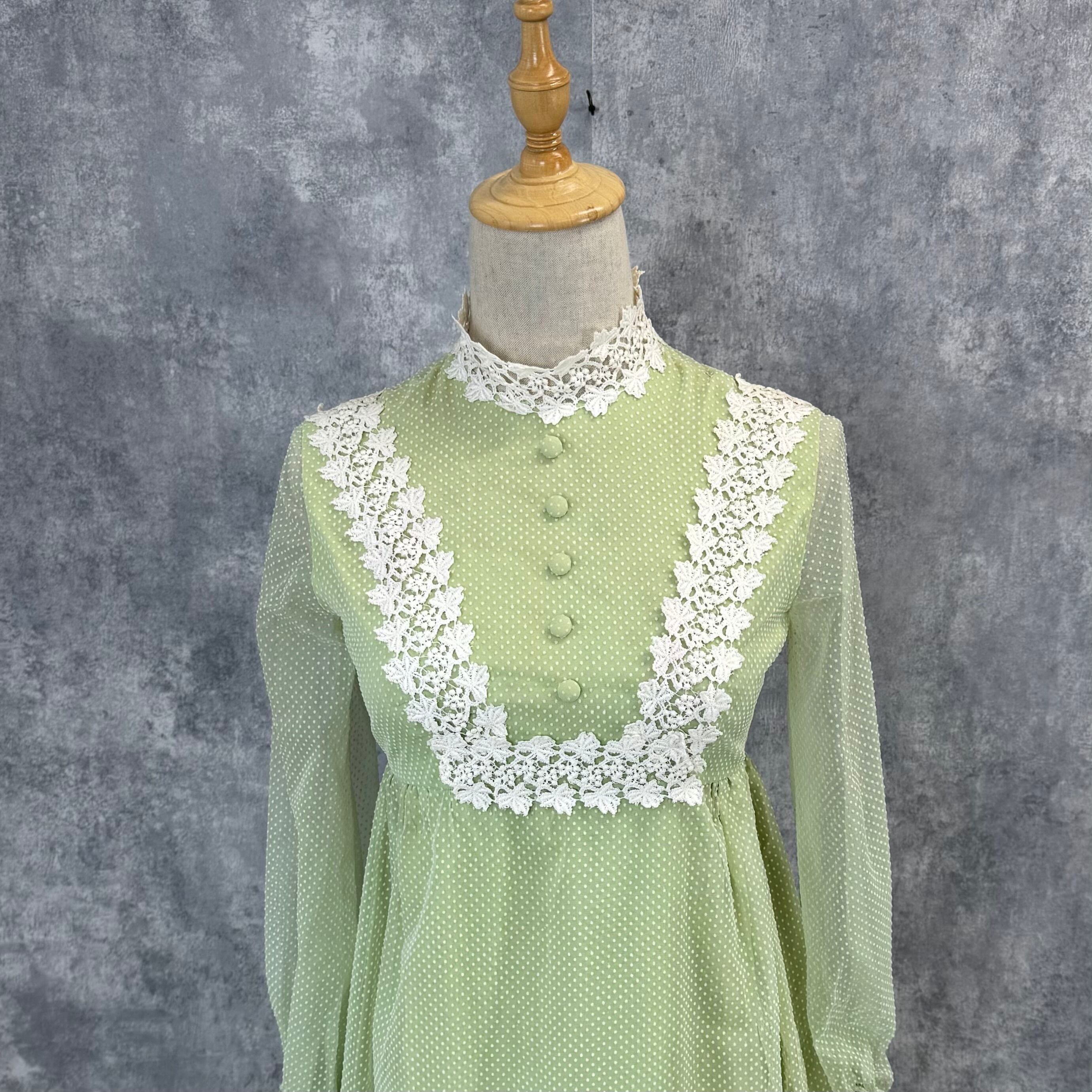 ふんわりとしたシアー素材に、淡いグリーンのドット柄が重なり、どこか懐かしくも洗練された印象のワンピース
