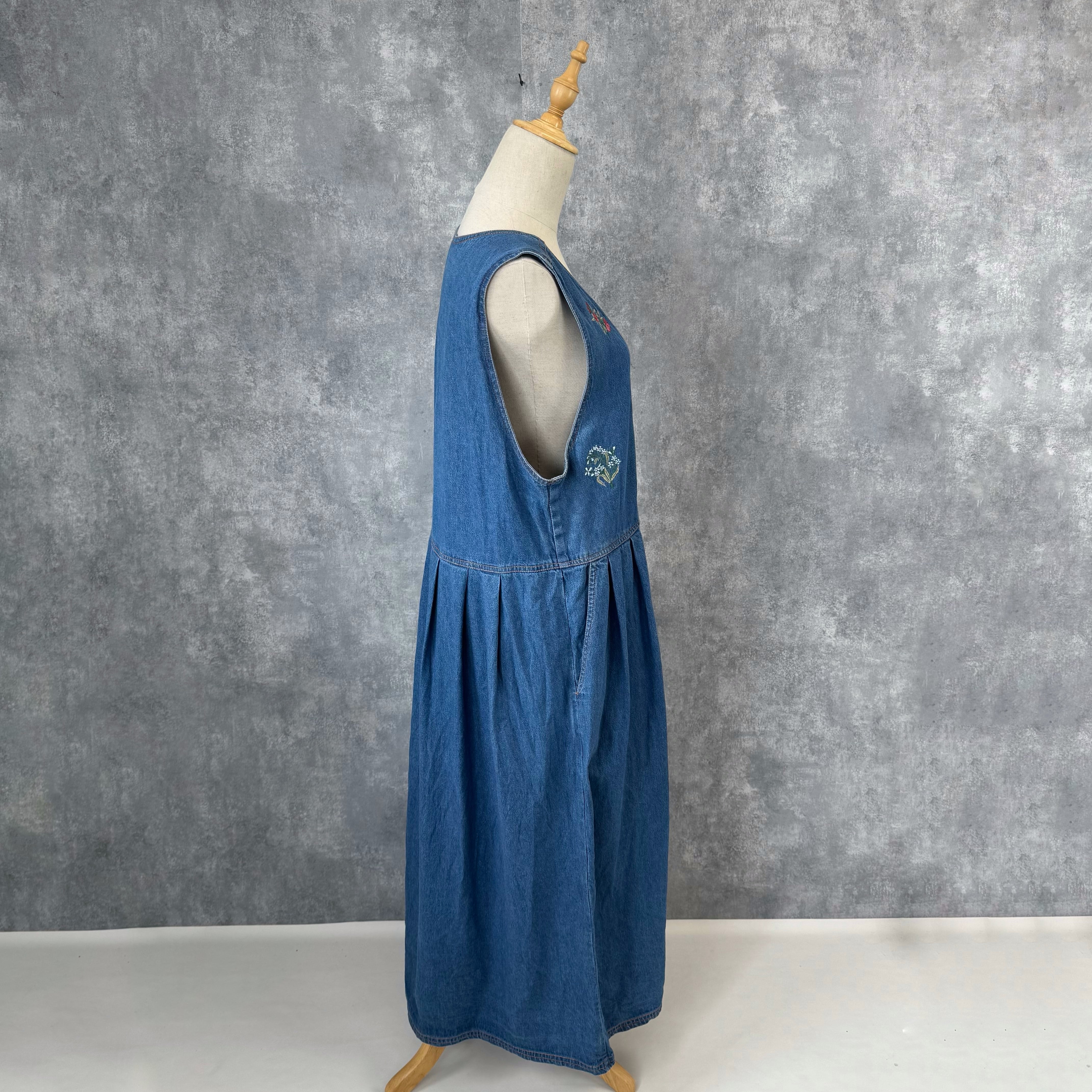草花のささやきをまとう* 刺繍入り デニム生地 ノースリーブワンピース