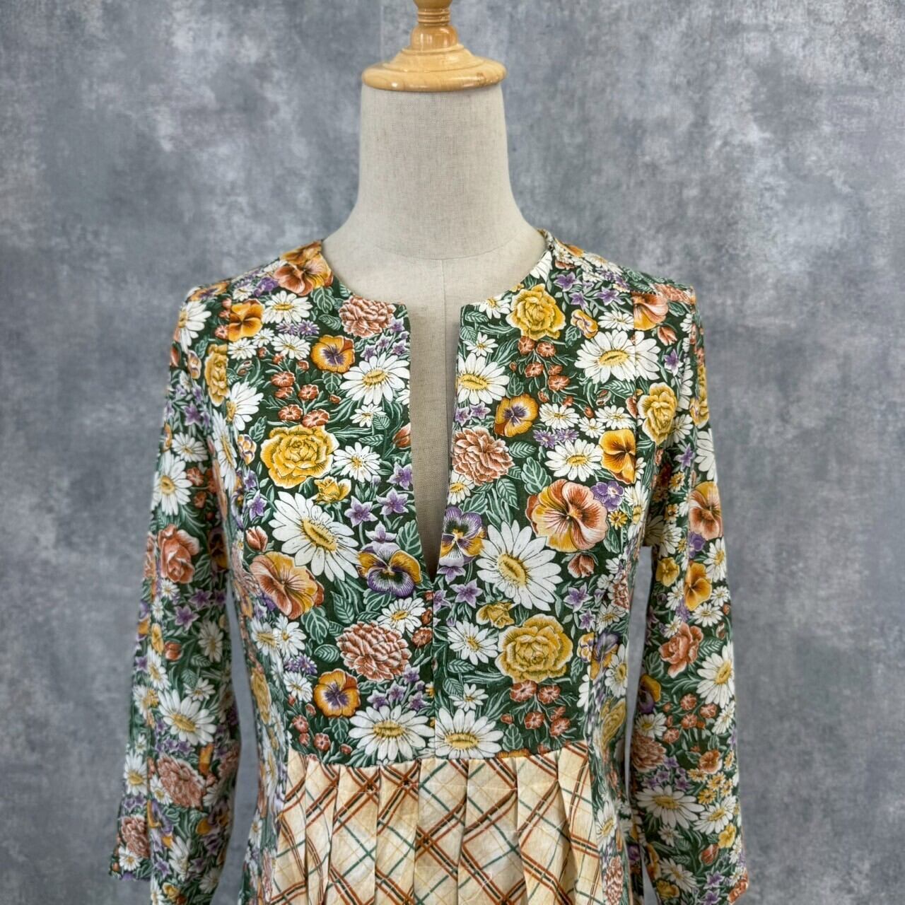トップス⇨深みのあるフォレストグリーンをベースに、マスタード、ラベンダー、オフホワイト、ローズピンクのフローラル柄