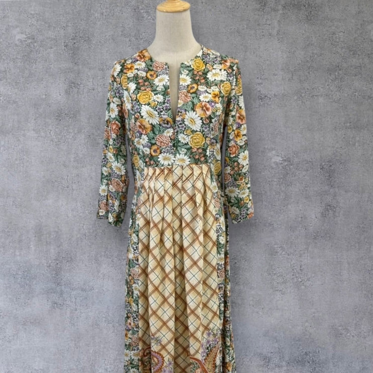 スカート部分⇨クリームベージュ×ブラウン系チェックに、ペイズリーや花柄の切替がアクセント