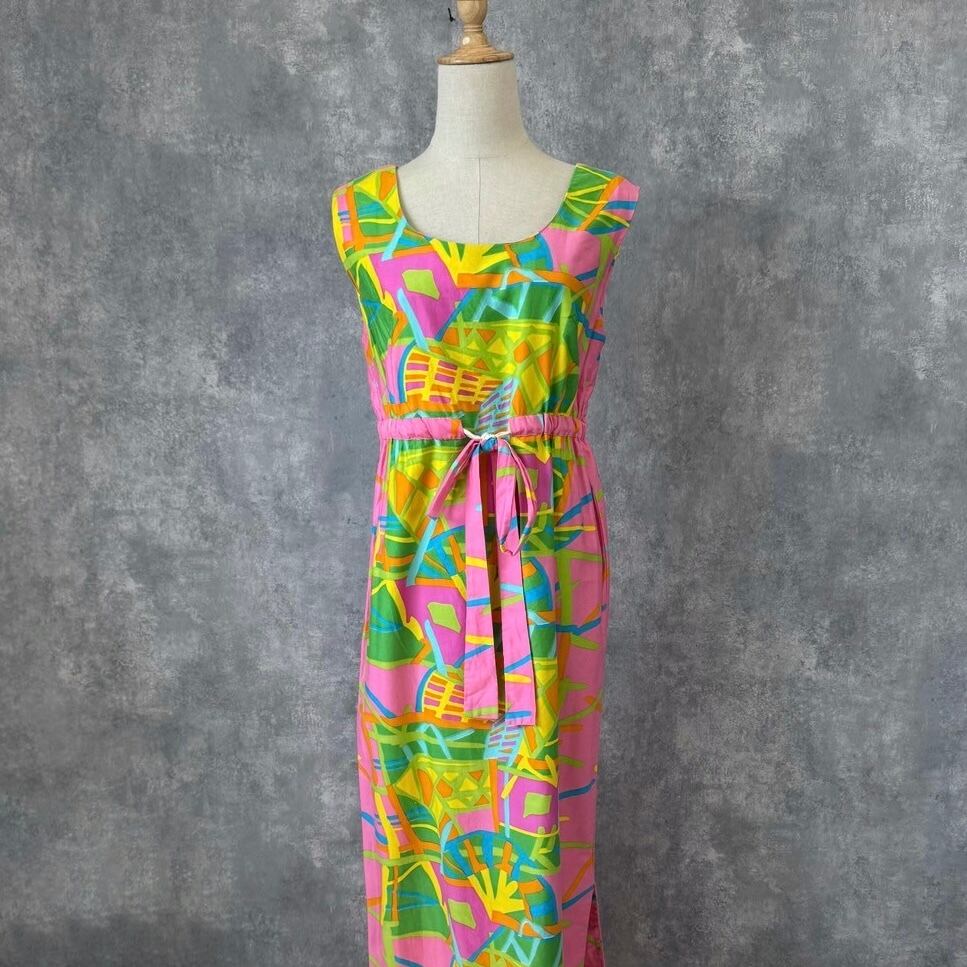 パッと目を引くピンク地にネオンのようなカラーが弾ける幾何学模様のマキシワンピース