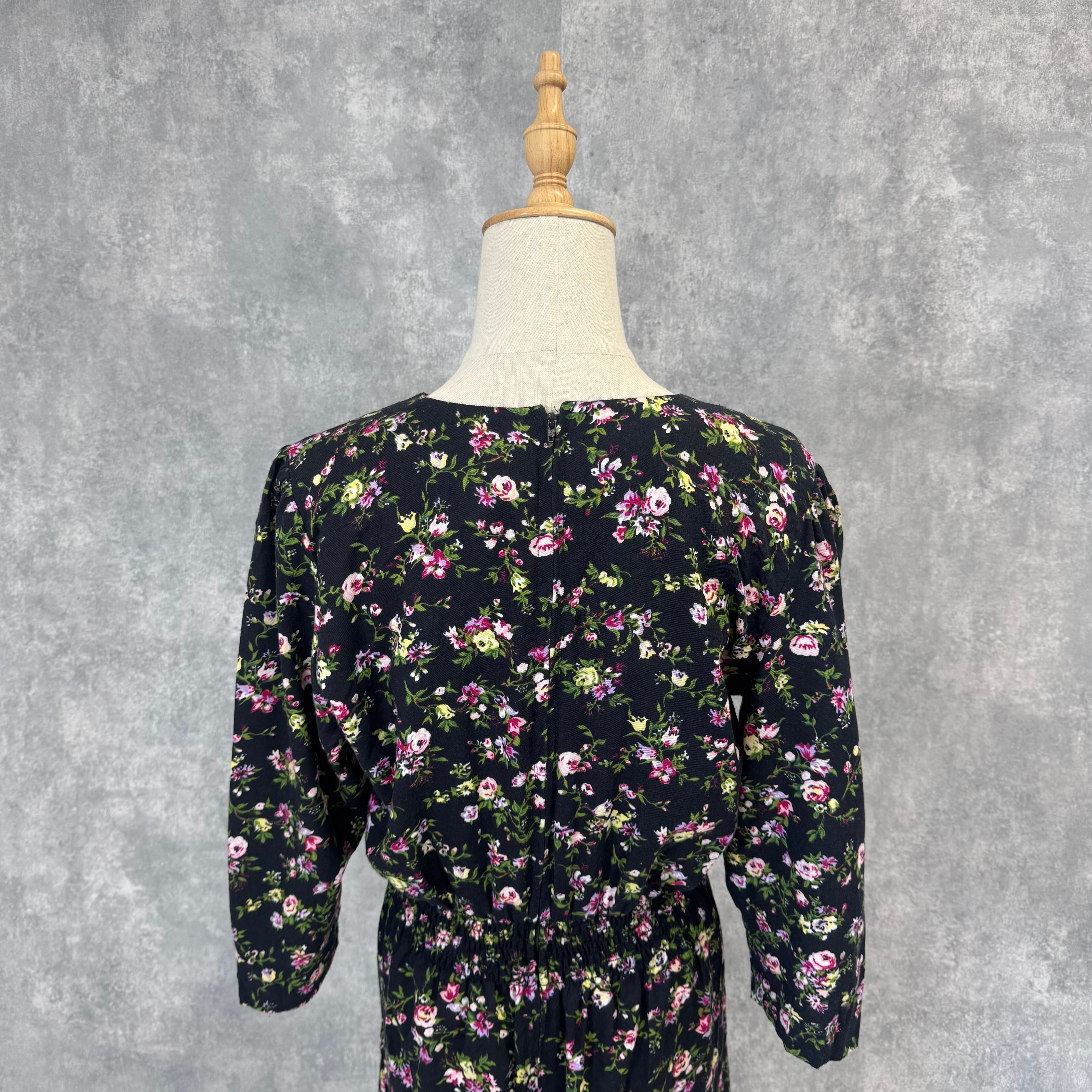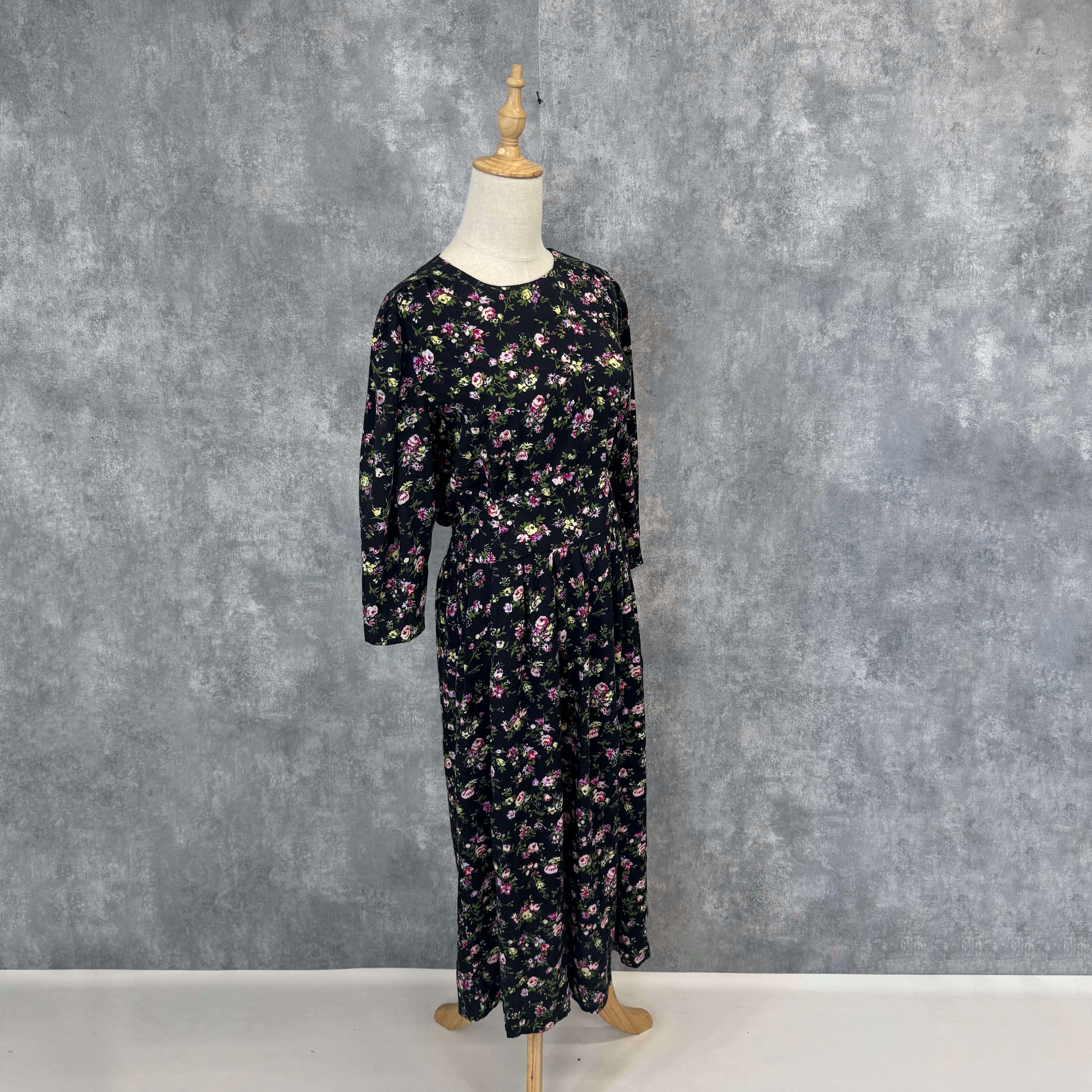 ブラックベースに小さな薔薇が咲き誇る、クラシカルな雰囲気の花柄ワンピース。