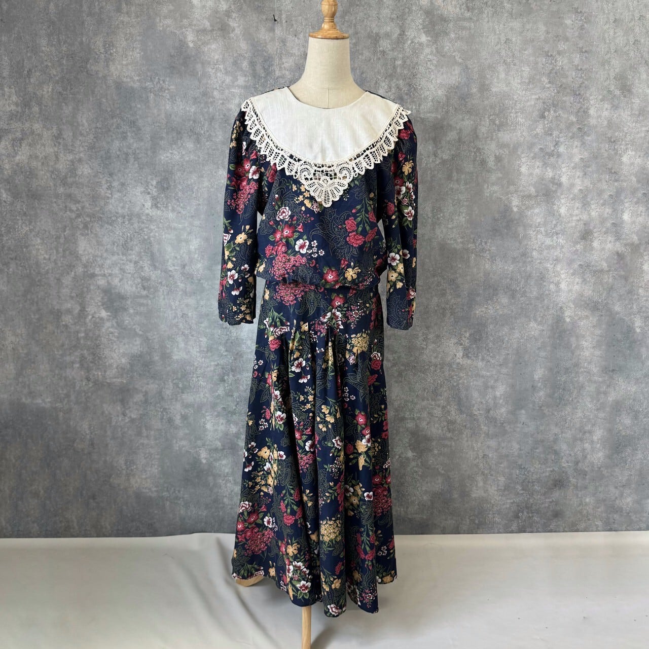 落ち着いたネイビーベースにクラシカルな花柄が上品に映える一着。