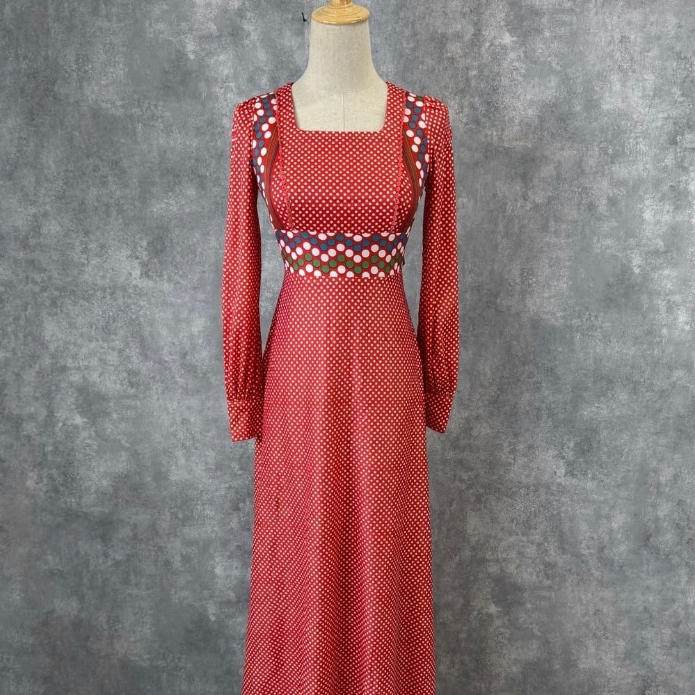 クラシカルなスクエアネックにマルチドットの切り替えが目を引くレトロロングワンピース。