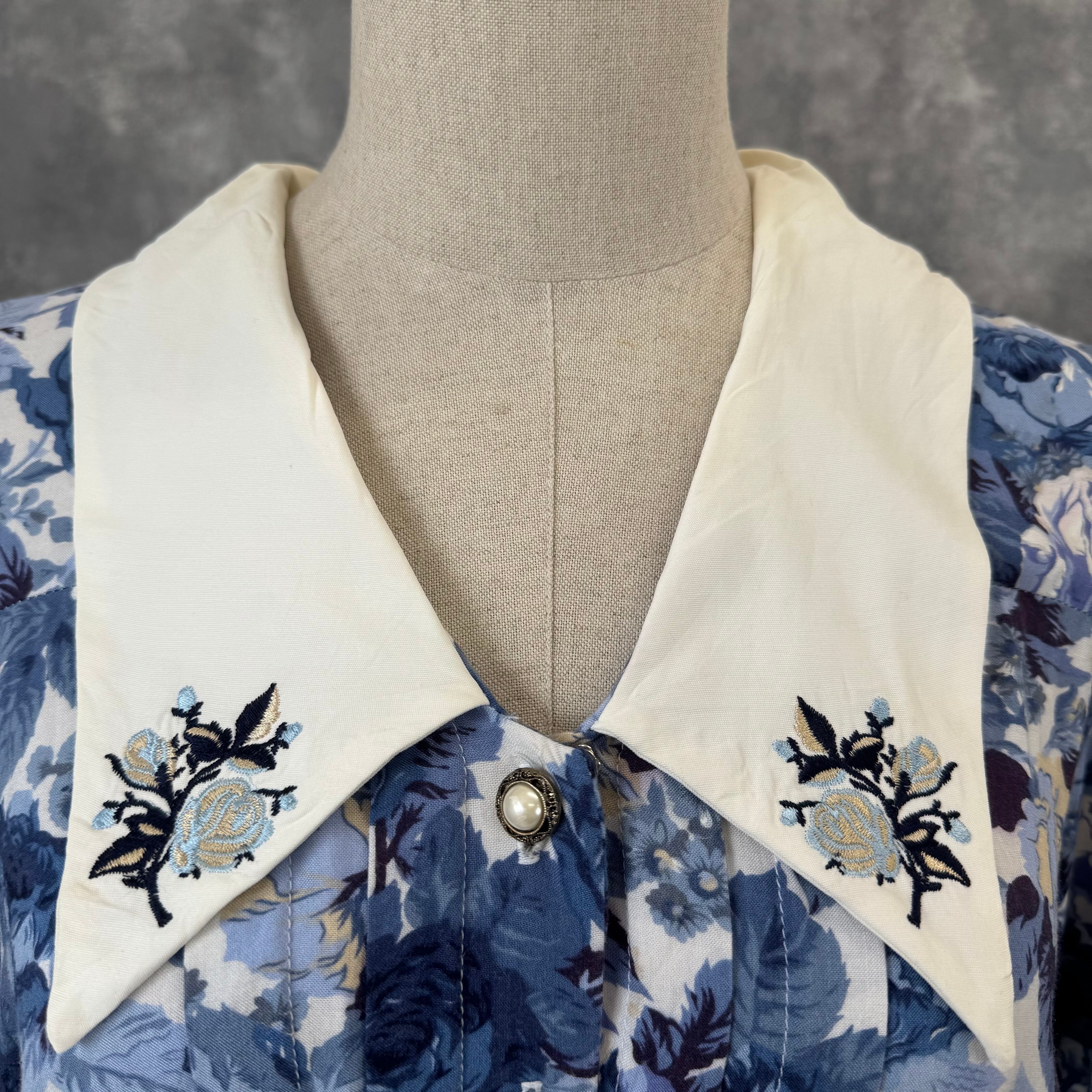 襟元には刺繍があしらわれ、甘さの中にどこかクラシカルなエッセンスを感じさせます。