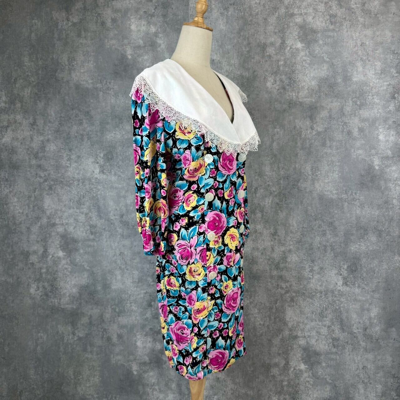 鮮やかなピンク・イエロー・ターコイズの花々が咲き誇るデザインに繊細なレースをあしらった