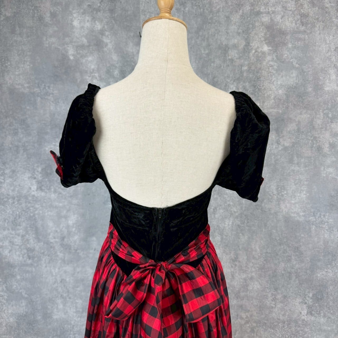 ベルベットの上身頃と赤×黒チェックのタフタフレアスカート。