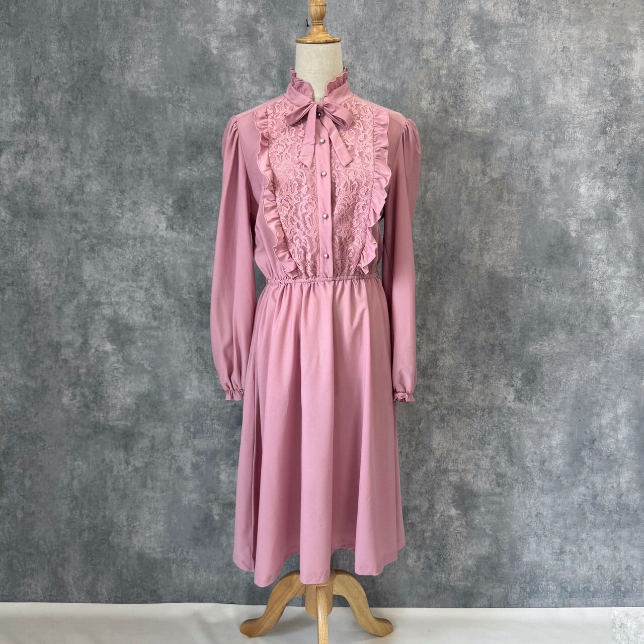 繊細なレース、くるみボタン、首元のリボンタイ。