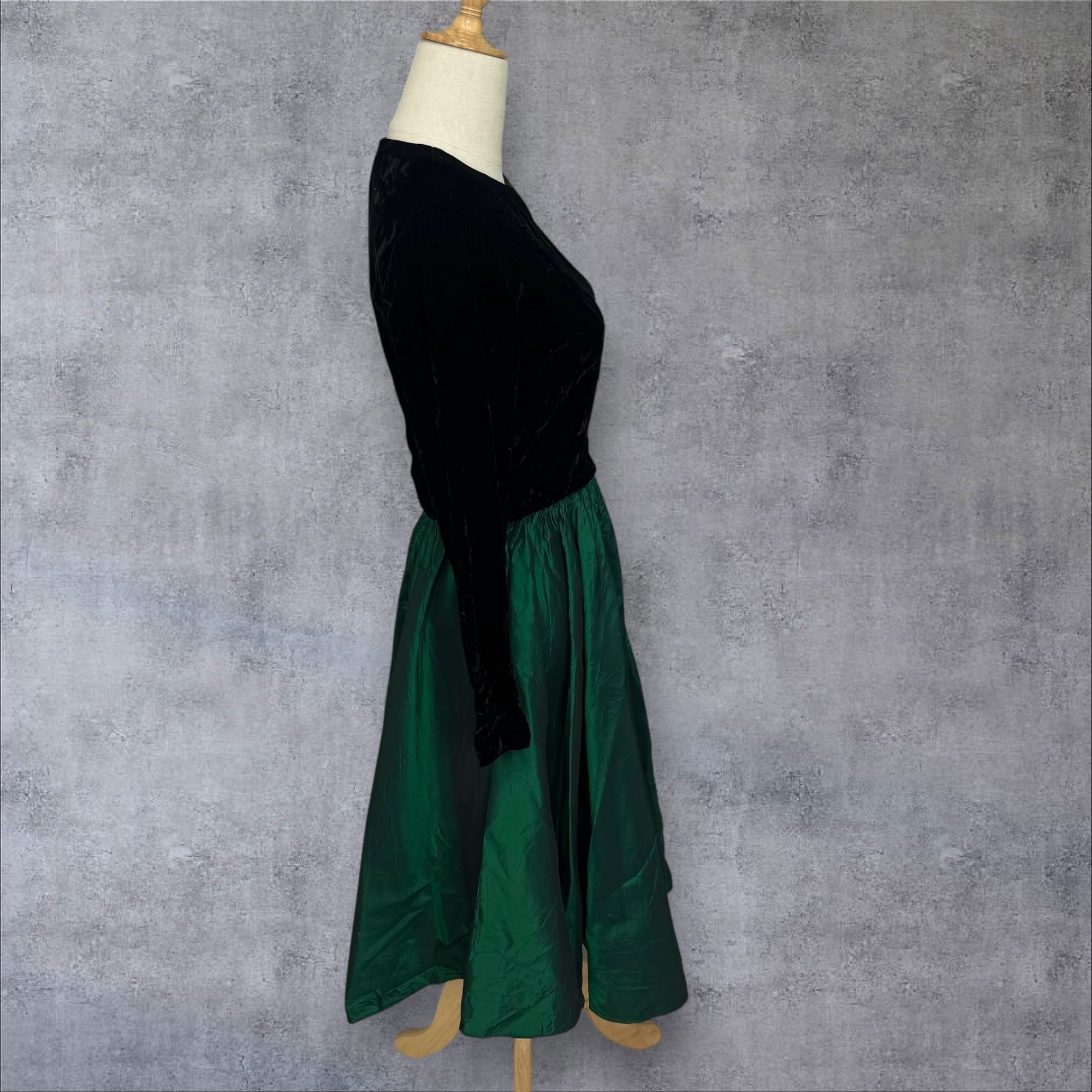 光を吸い込むような深いブラックのベルベットトップと、艶やかに揺れるディープグリーンのタフタスカートが印象的な、クラシカルな一着。