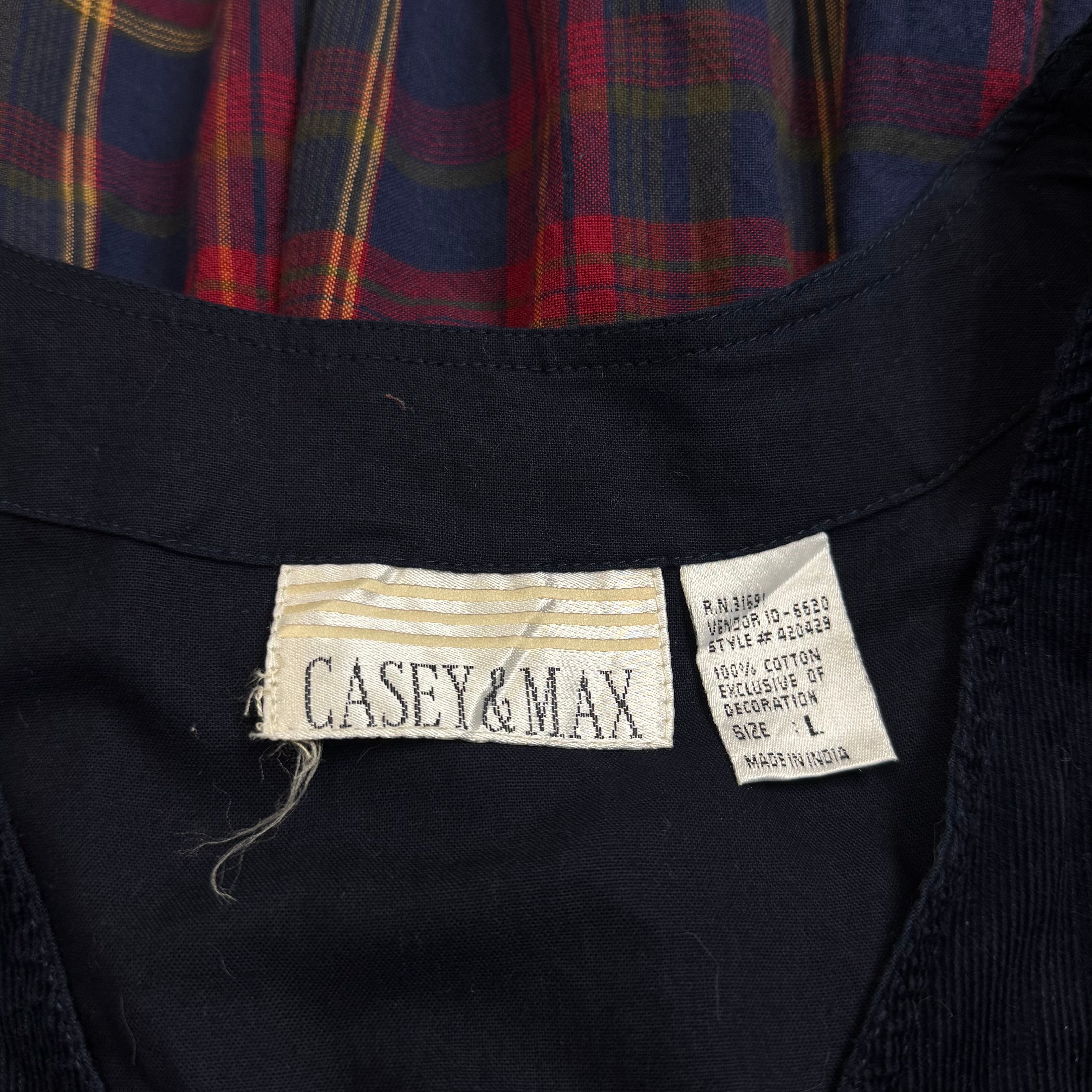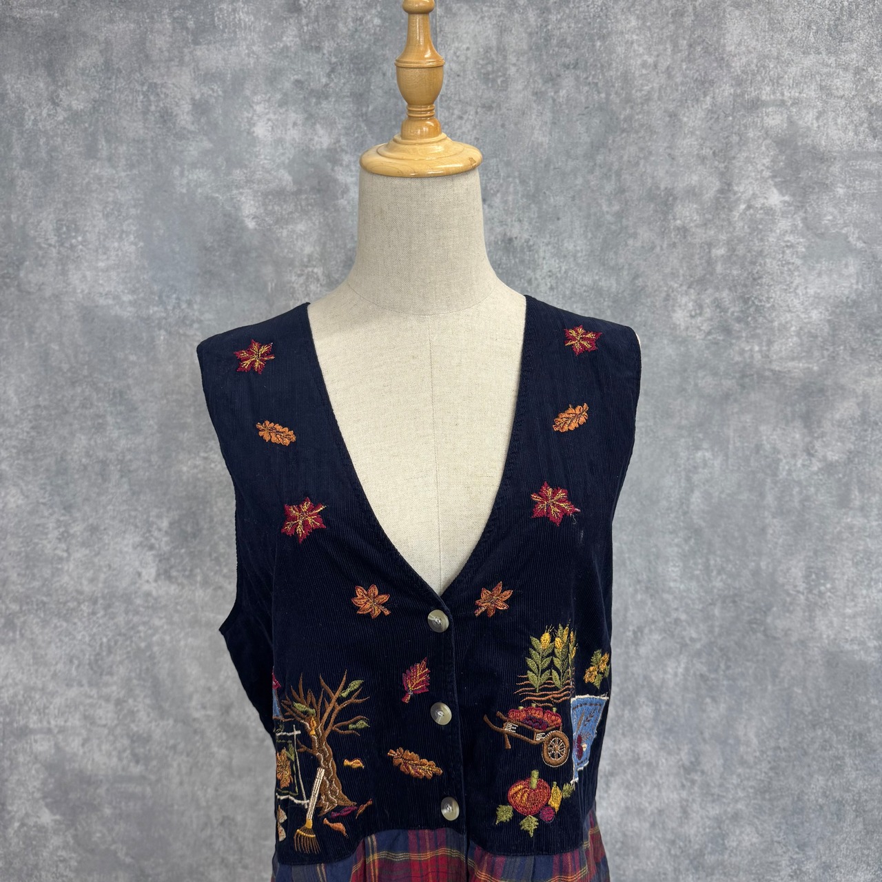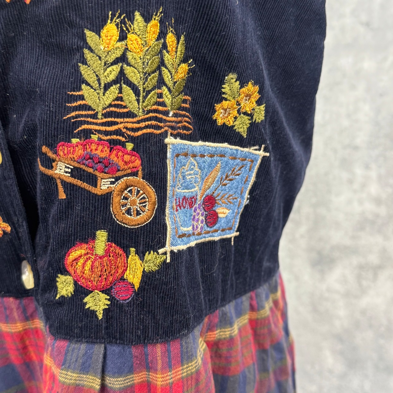 秋の刺繍が可愛い コーデュロイ×チェック柄スカートのジャンパーワンピース(CASEY & MAX)