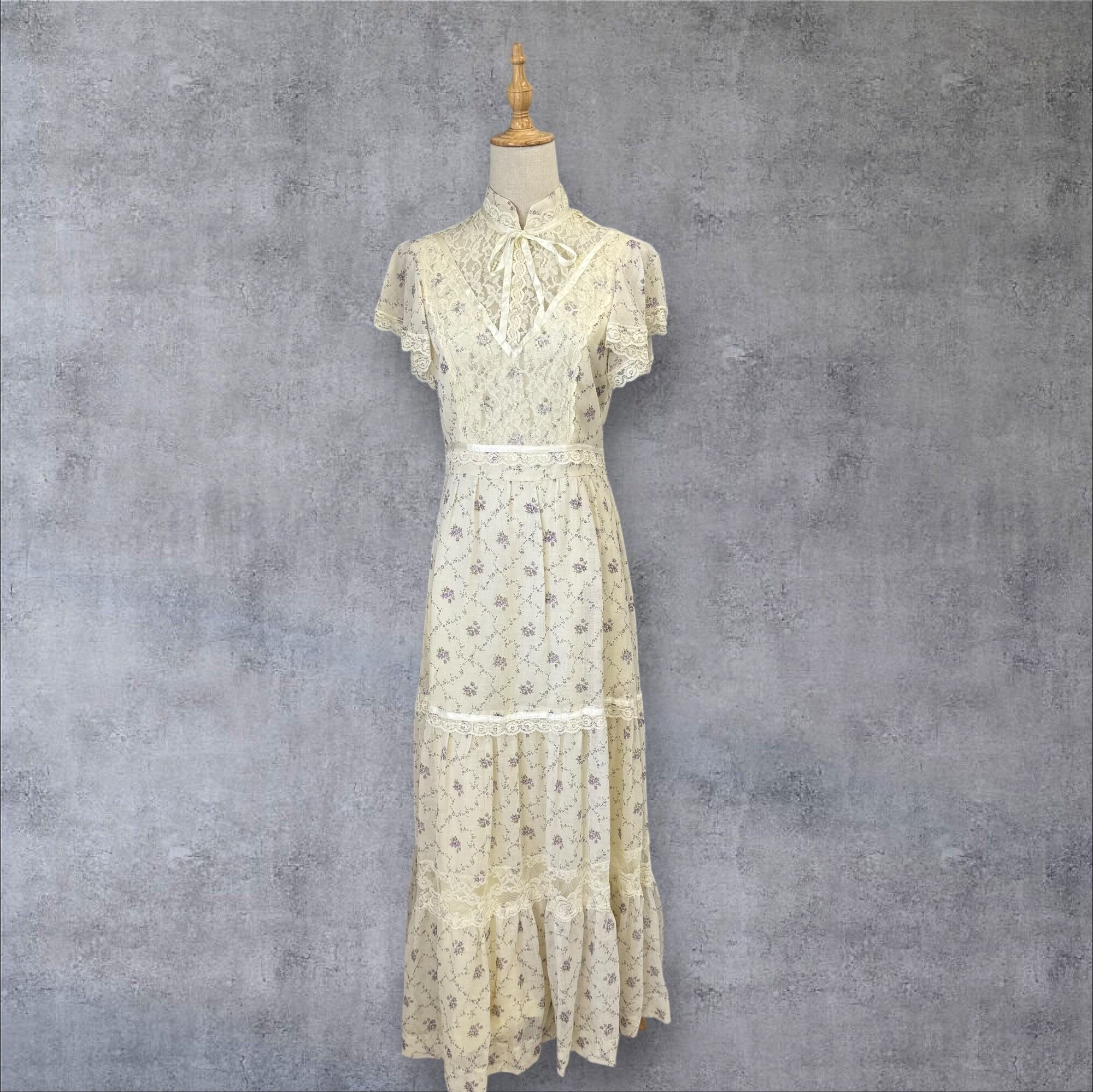 Vintage アイボリーレース & フローラル柄ワンピース パールボタンディテール