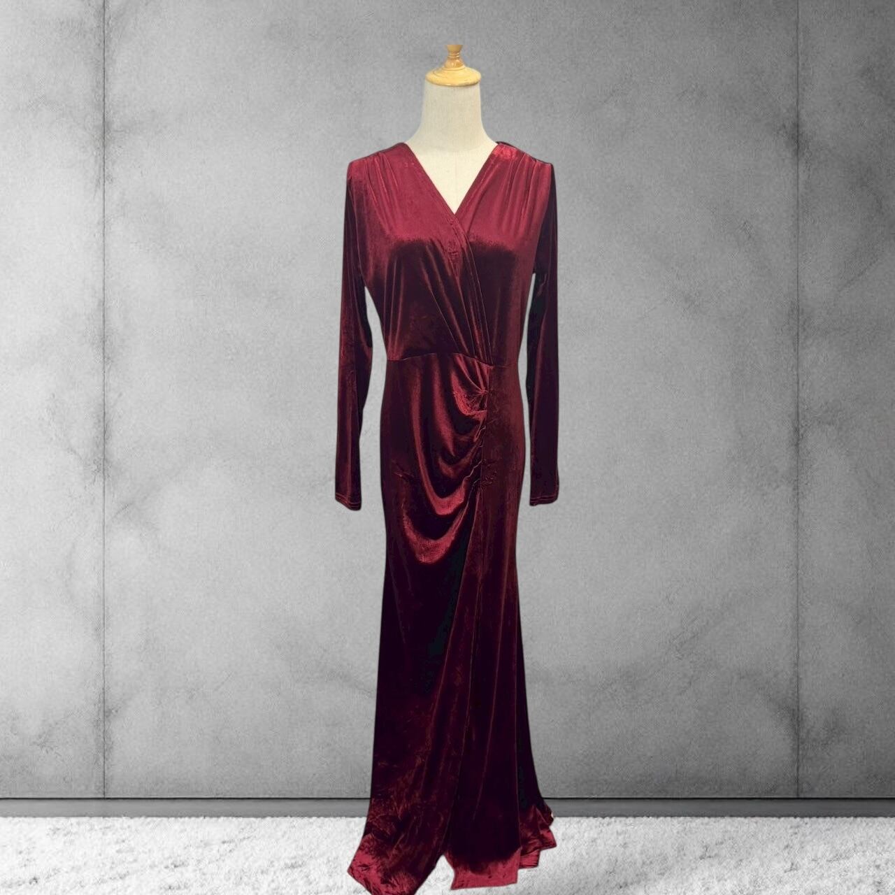 艷やかなボルドーカラーが目を引くベロアワンピース。