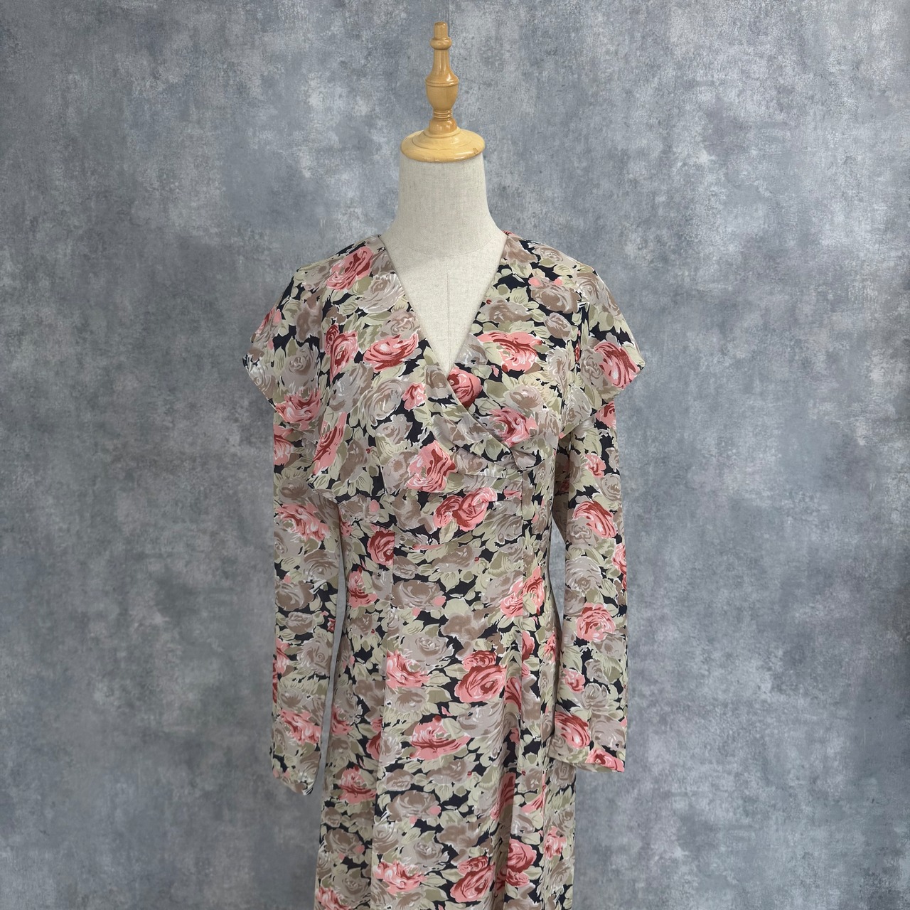 ほんのり光沢のあるポリエステル生地に、ベージュ×くすみピンク×ボルドーのバラ柄が咲き誇る、エレガントでクラシカルな一着です。