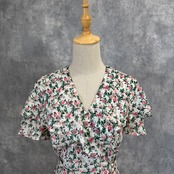 繊細なローズプリントに、サイドのパール調ボタンがクラシカルなアクセントを添えます。