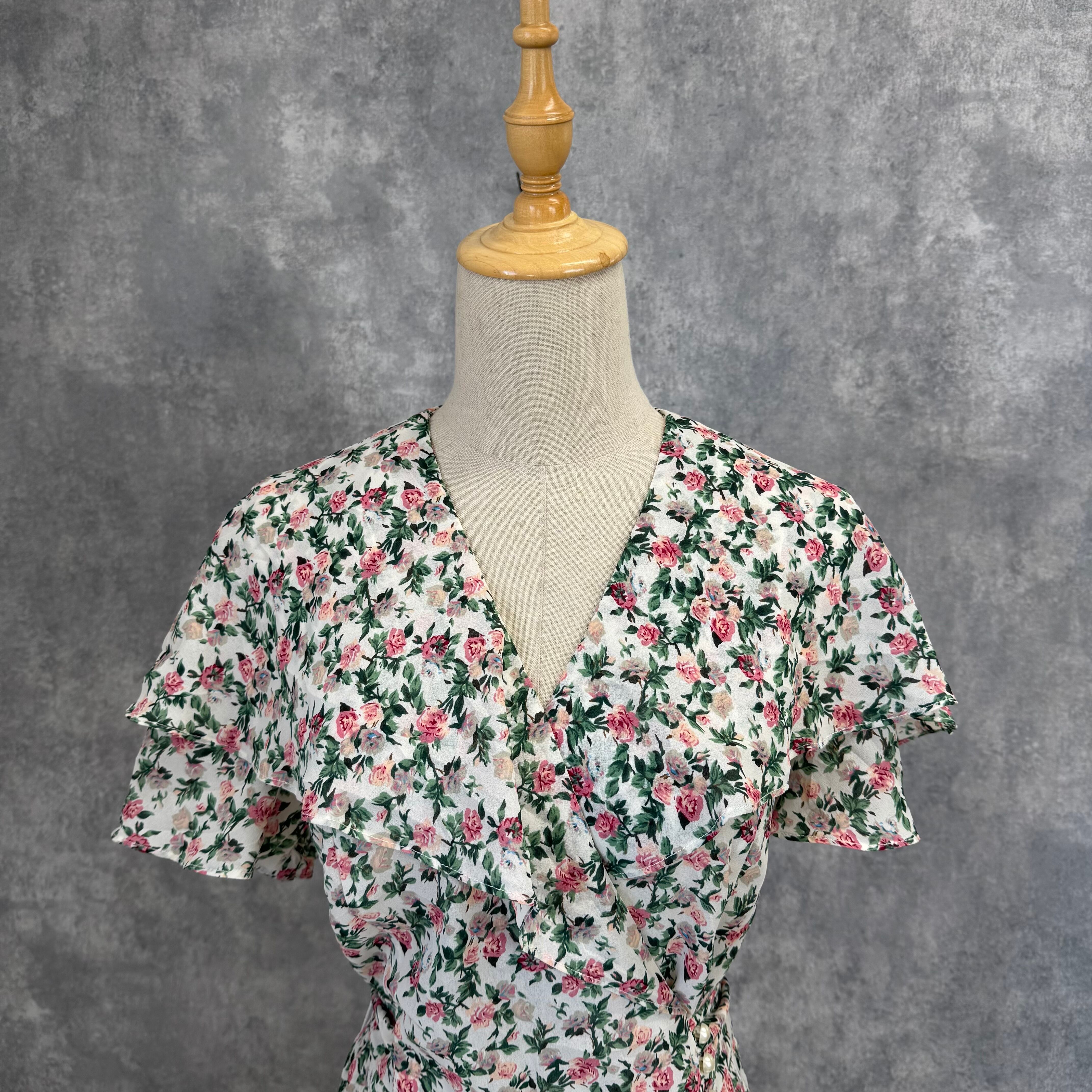 USA古着 ローズフラワーパターン パールボタン装飾 フレアカラー ヴィンテージドレス