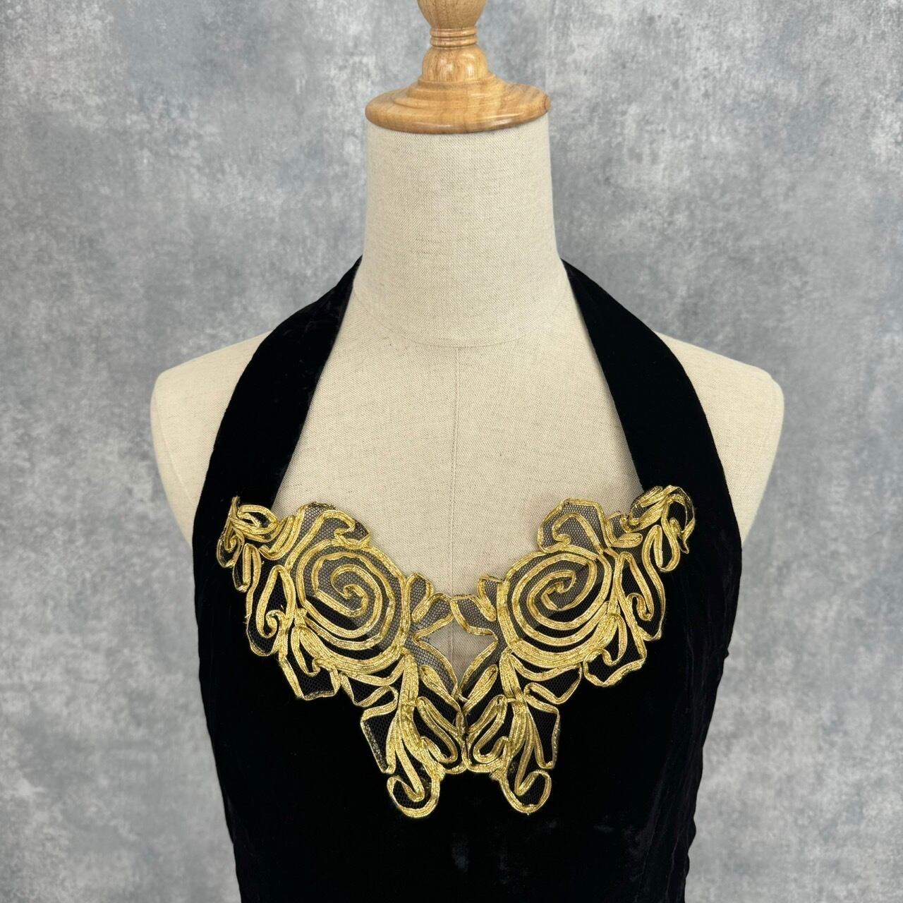 胸元に施されたゴールドの装飾がアクセントとなり、華やかでエレガントな印象に仕上がっています。
