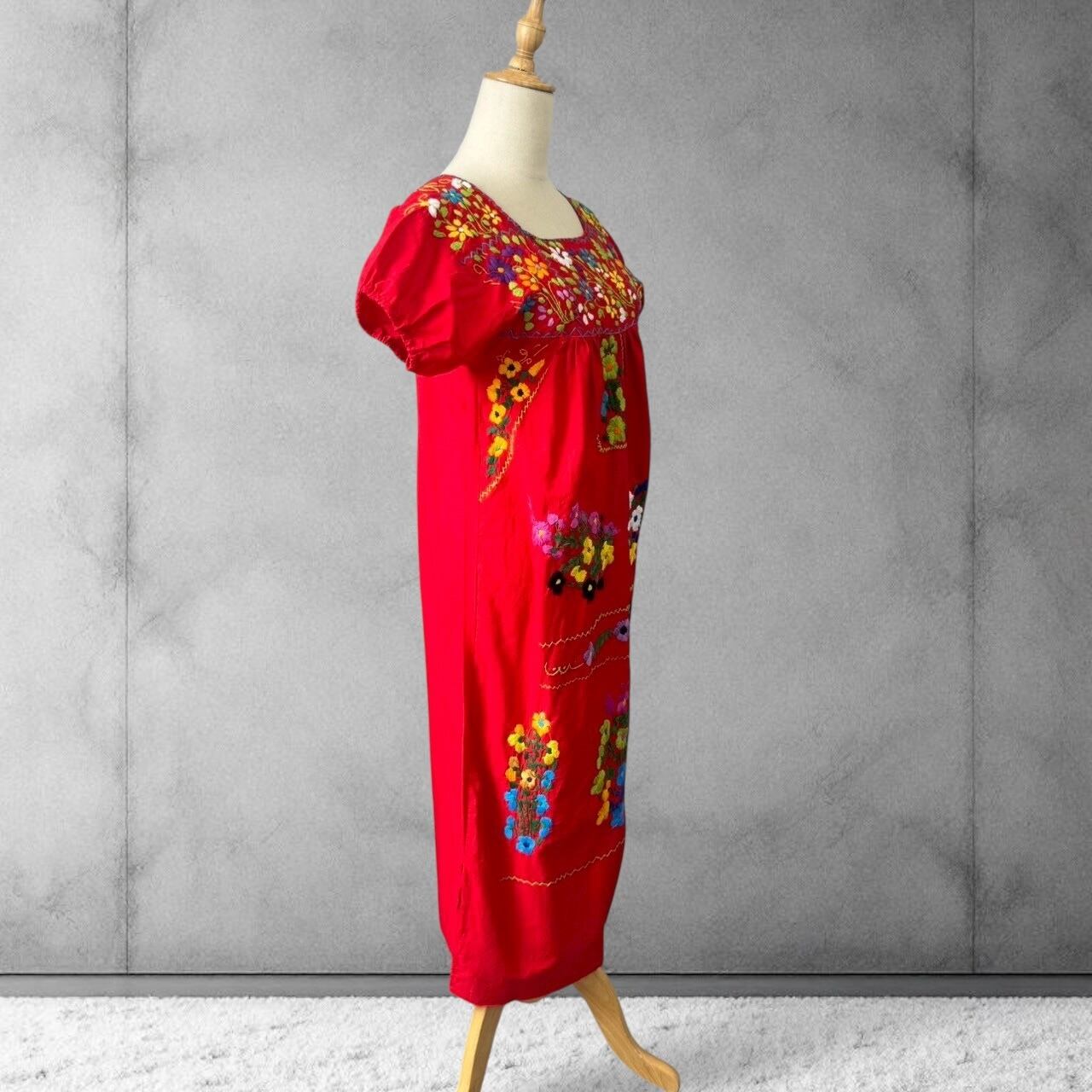 鮮やかなレッドカラーに、カラフルで細やかなフラワー刺繍が目を惹くメキシカンワンピース。