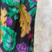 ダークベースにパープルやレッドの花柄が映える、大人の華やかさを演出する一着です。