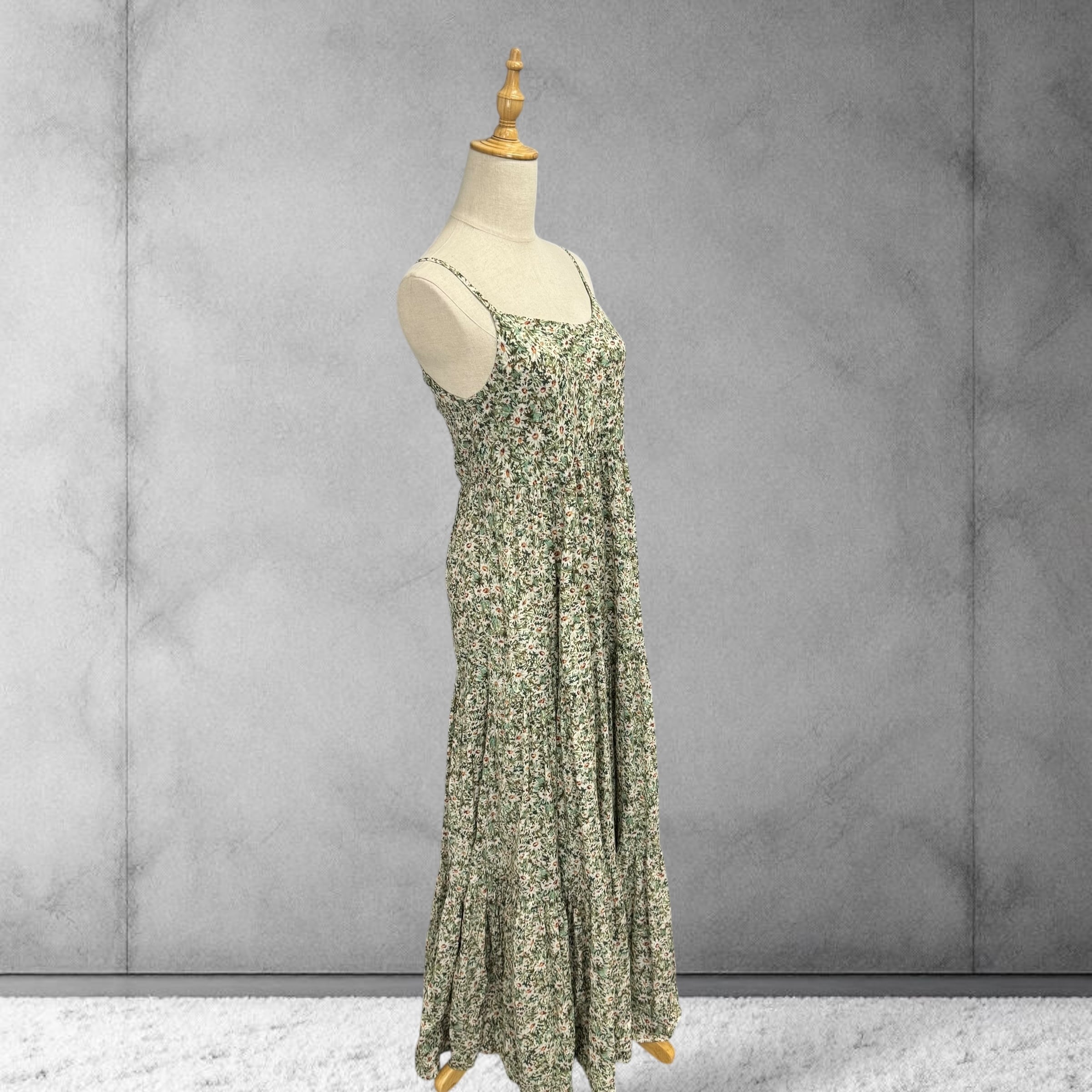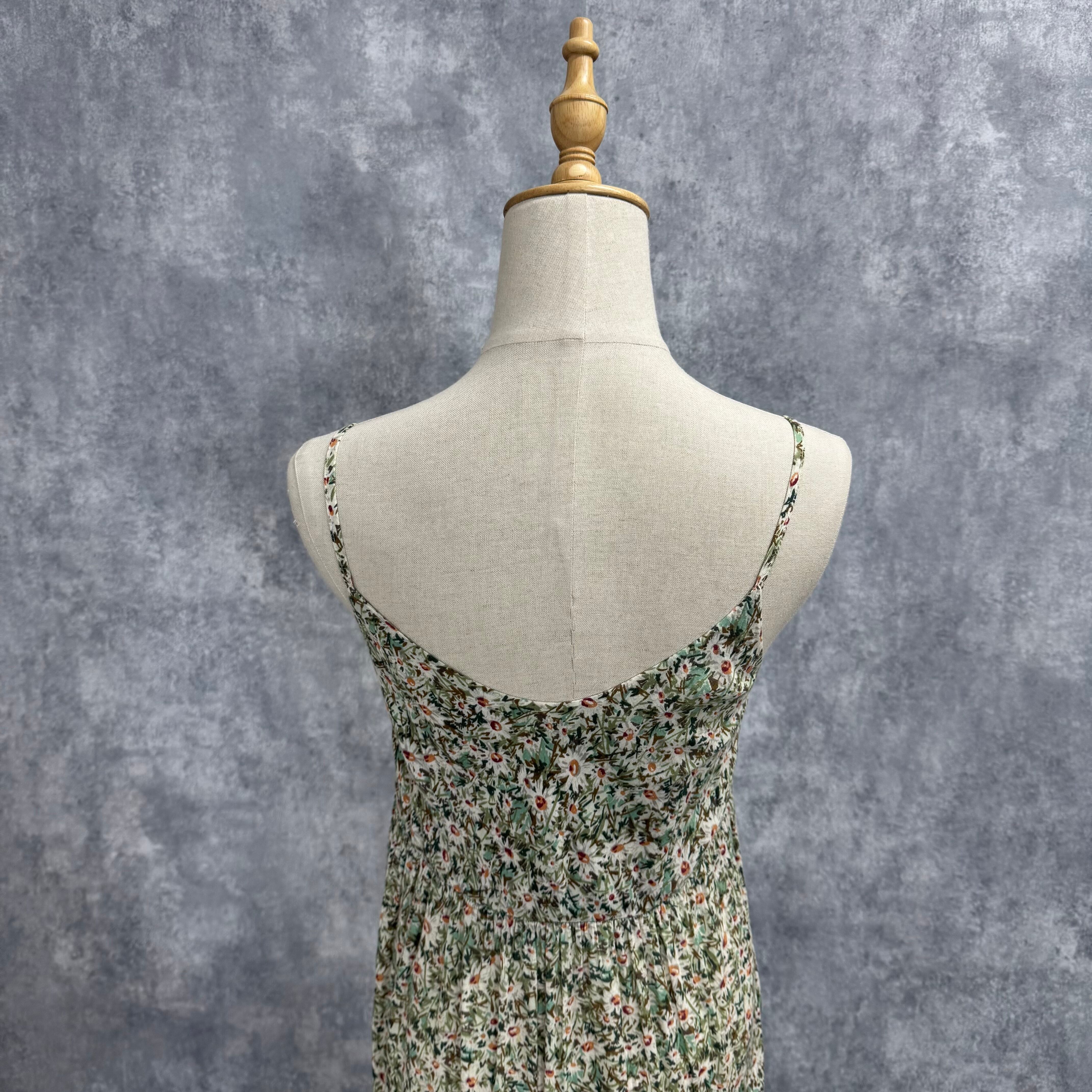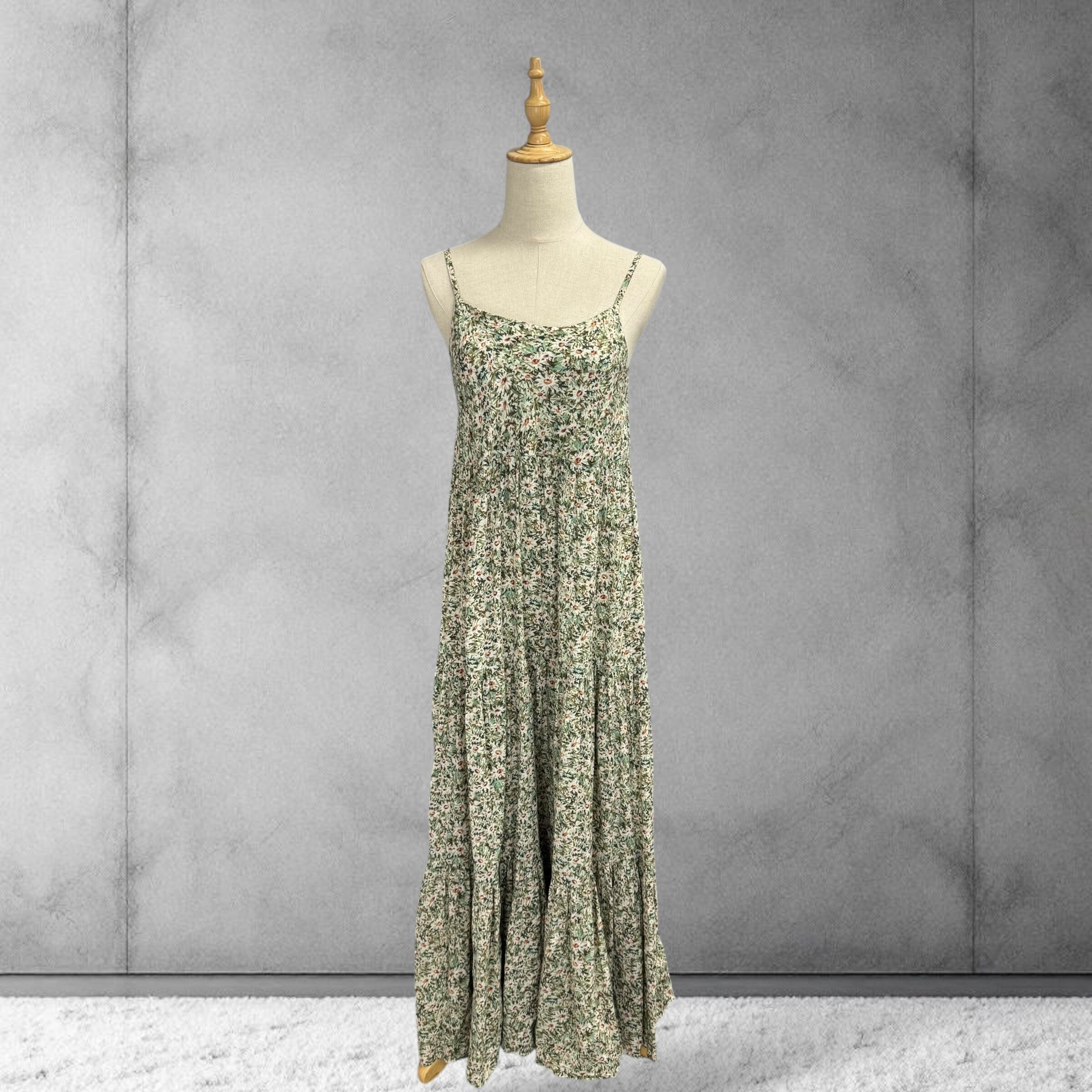 レトロガーリー 草花柄のキャミソールティアードワンピース マキシ丈