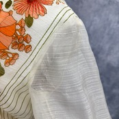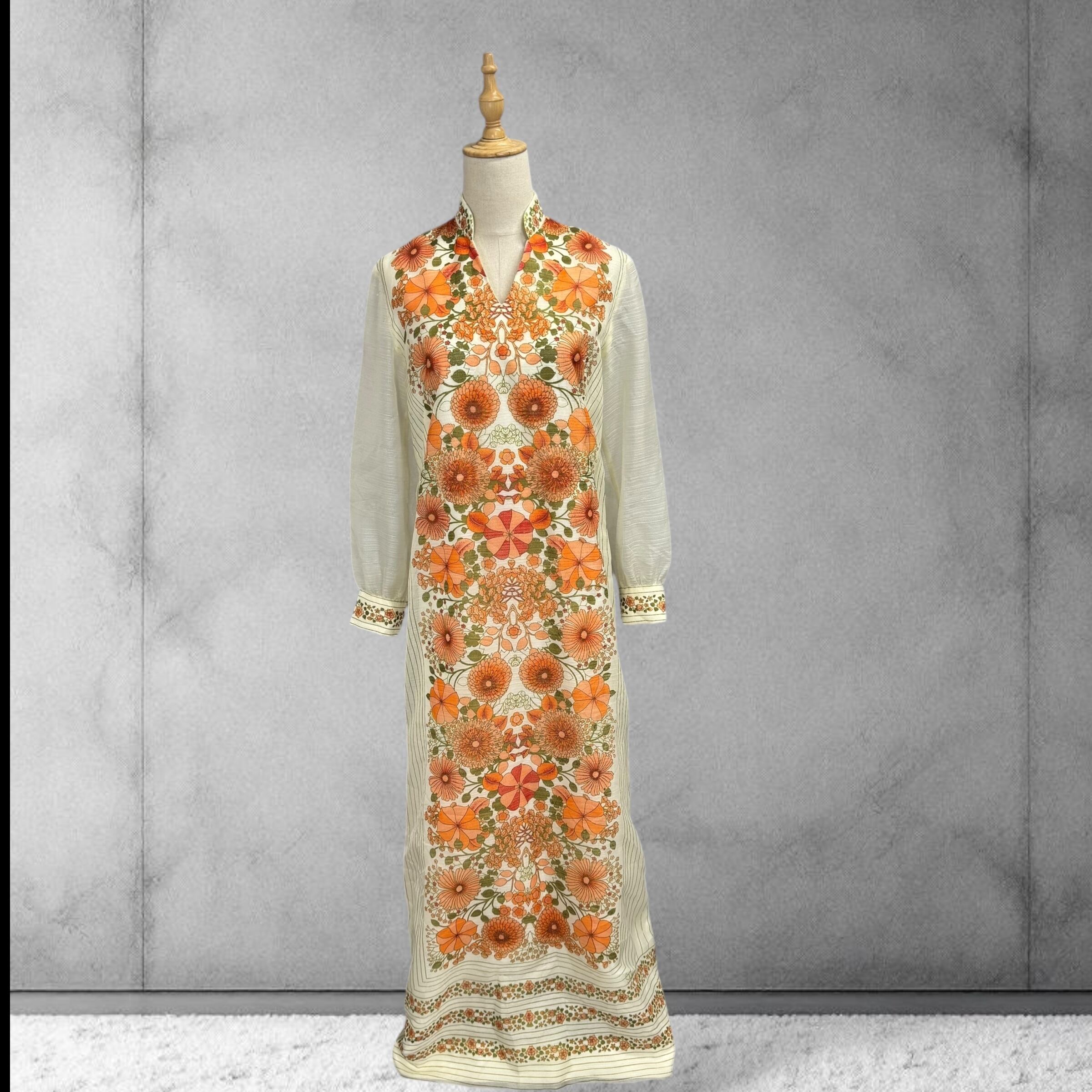 オレンジやグリーンの花々が連なる大胆なフラワープリントが目を惹くヴィンテージロングドレス。