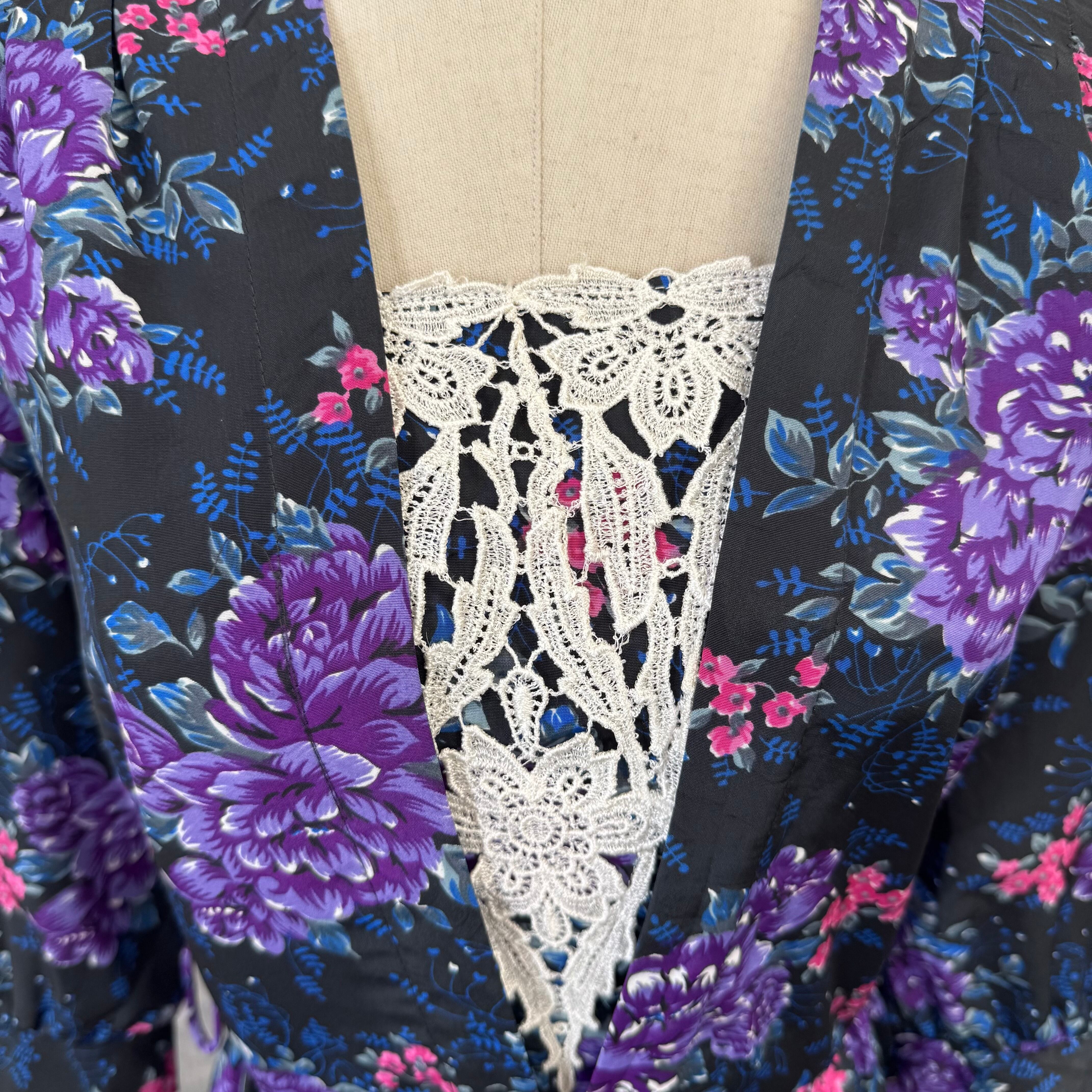 深みのあるブラックをベースに、紫やブルーの花柄が映えるデザイン。
