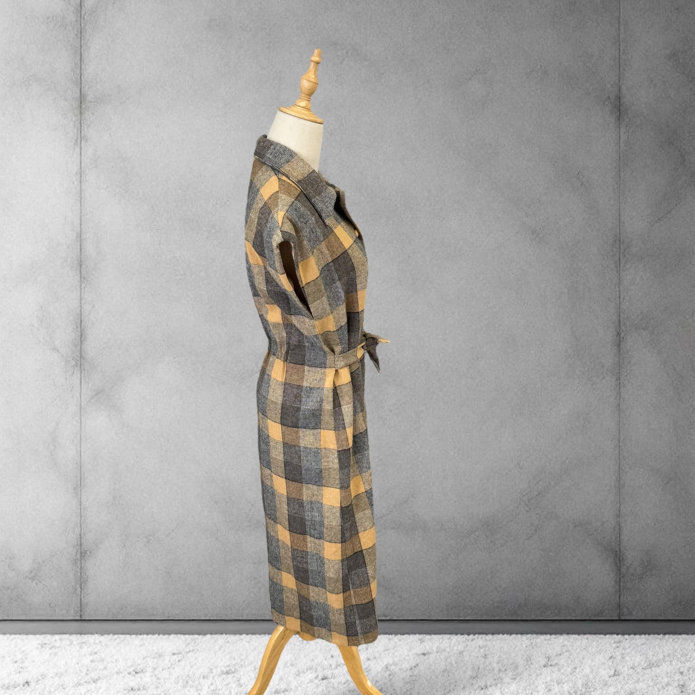 クラシックな雰囲気漂う大きめチェック柄のワンピース。落ち着いたイエローベージュ×グレー系カラーで