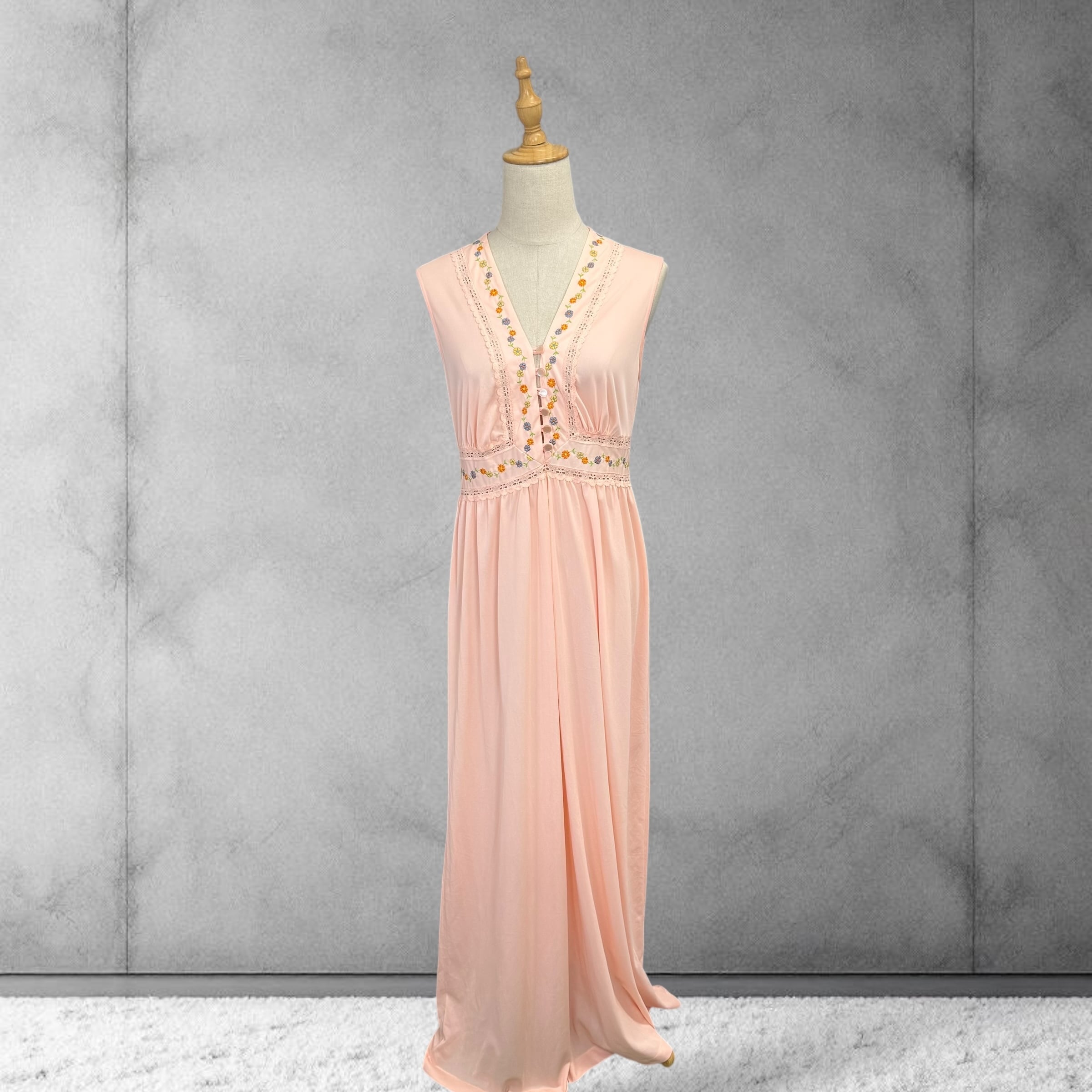 淡いピンクカラーにカラフルな小花の刺繍が映えるヴィンテージワンピース。