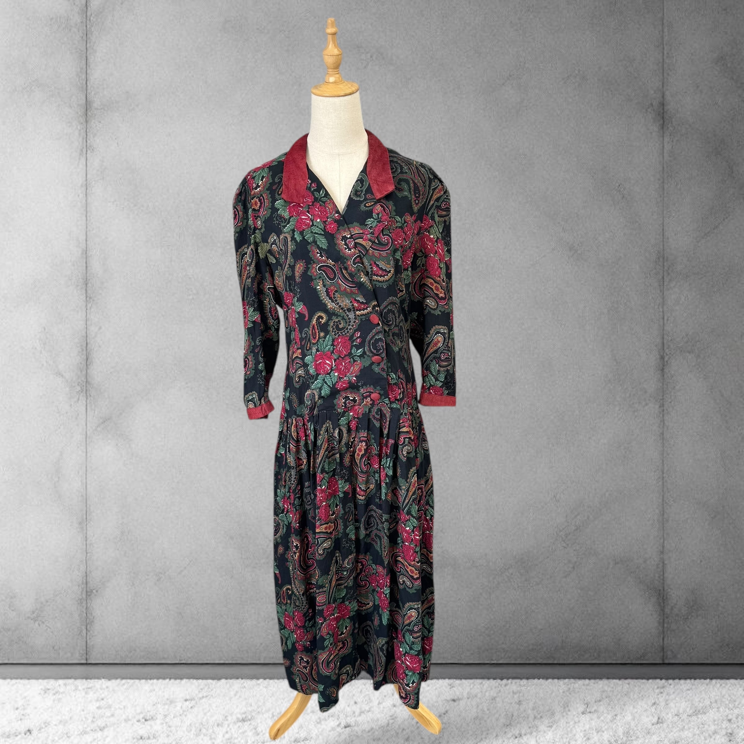 深みのあるブラックをベースにペイズリーと花柄が重なり合う大人クラシカルなヴィンテージドレス。
