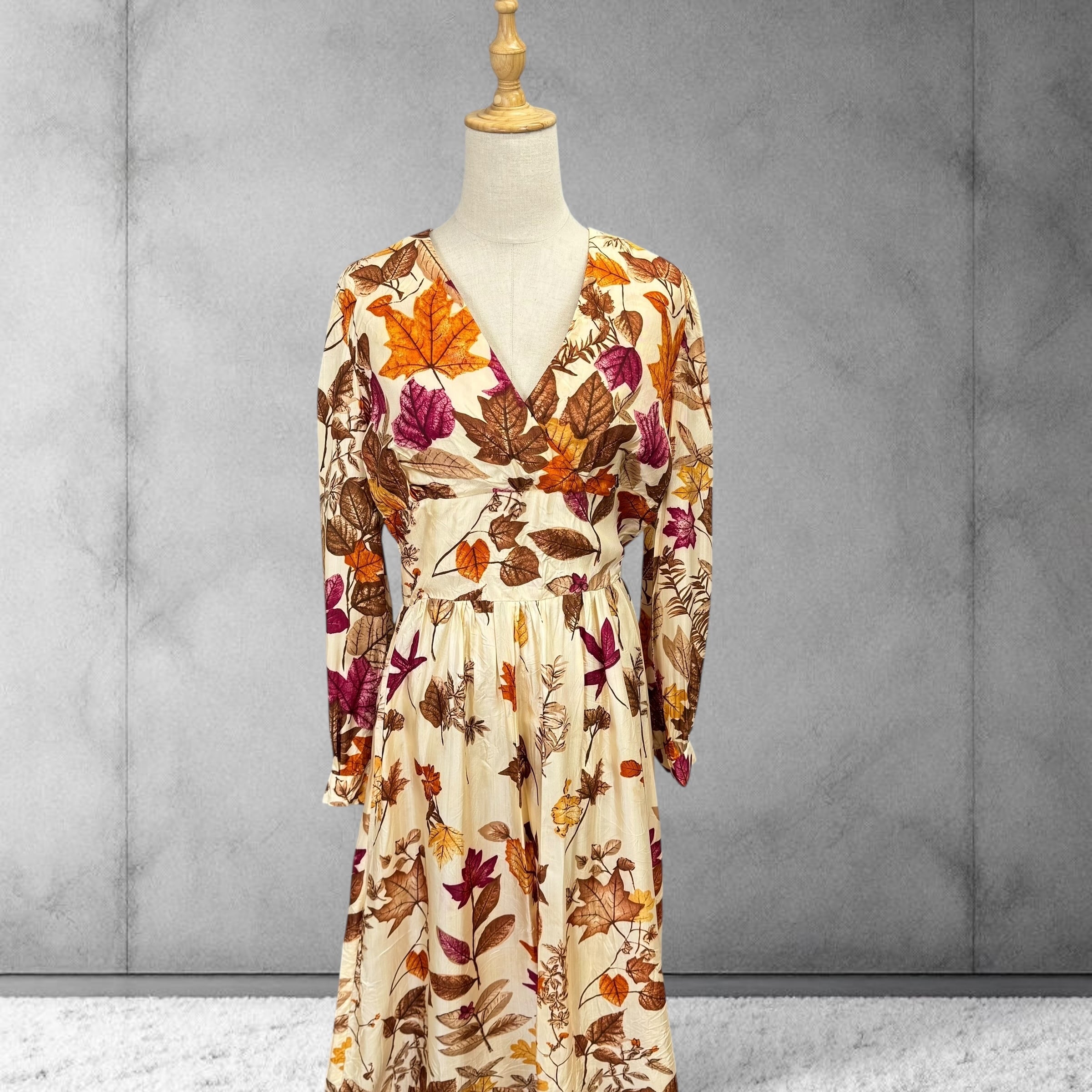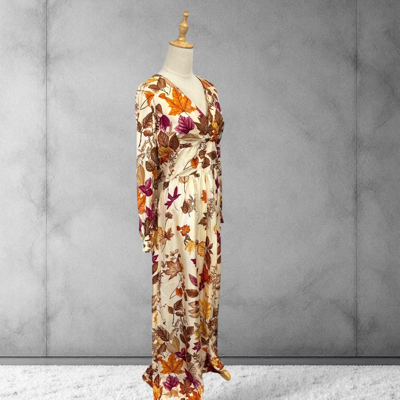 秋色 落ち葉舞うようなリーフ柄のロング丈ドレス カシュクール