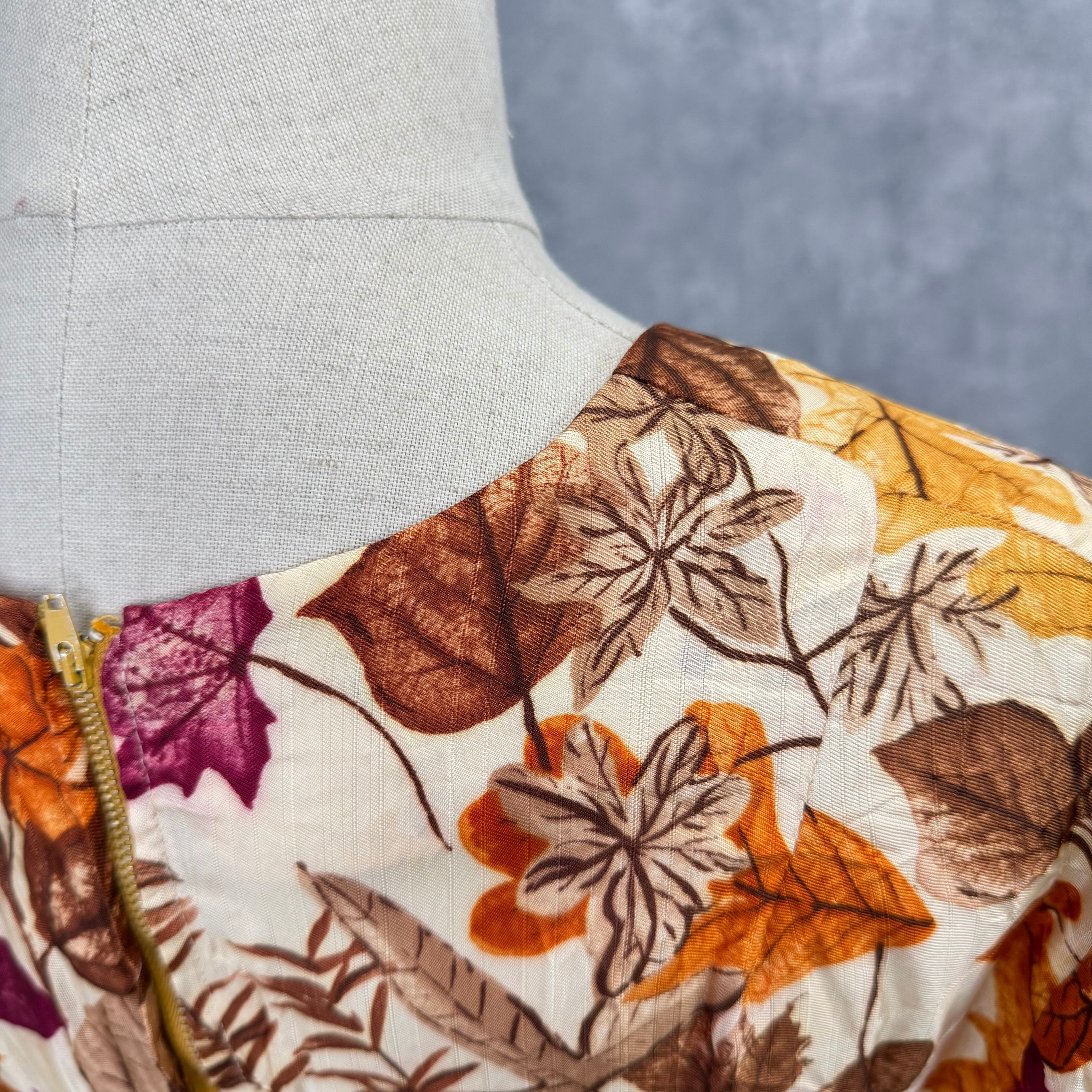 オータムカラーのリーフ柄が全面に広がるヴィンテージワンピース。