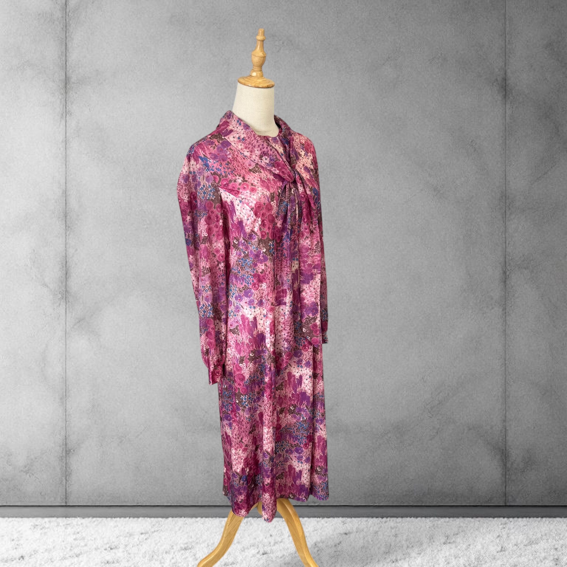 鮮やかなピンク×パープルのフラワープリントが印象的なヴィンテージワンピース。