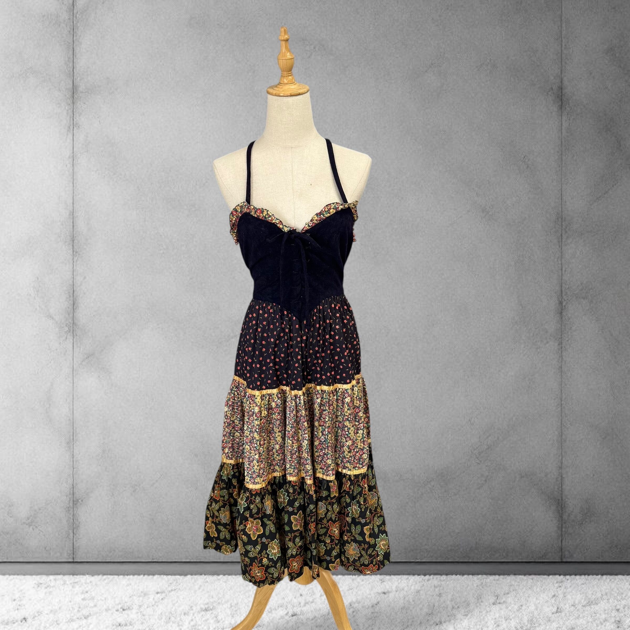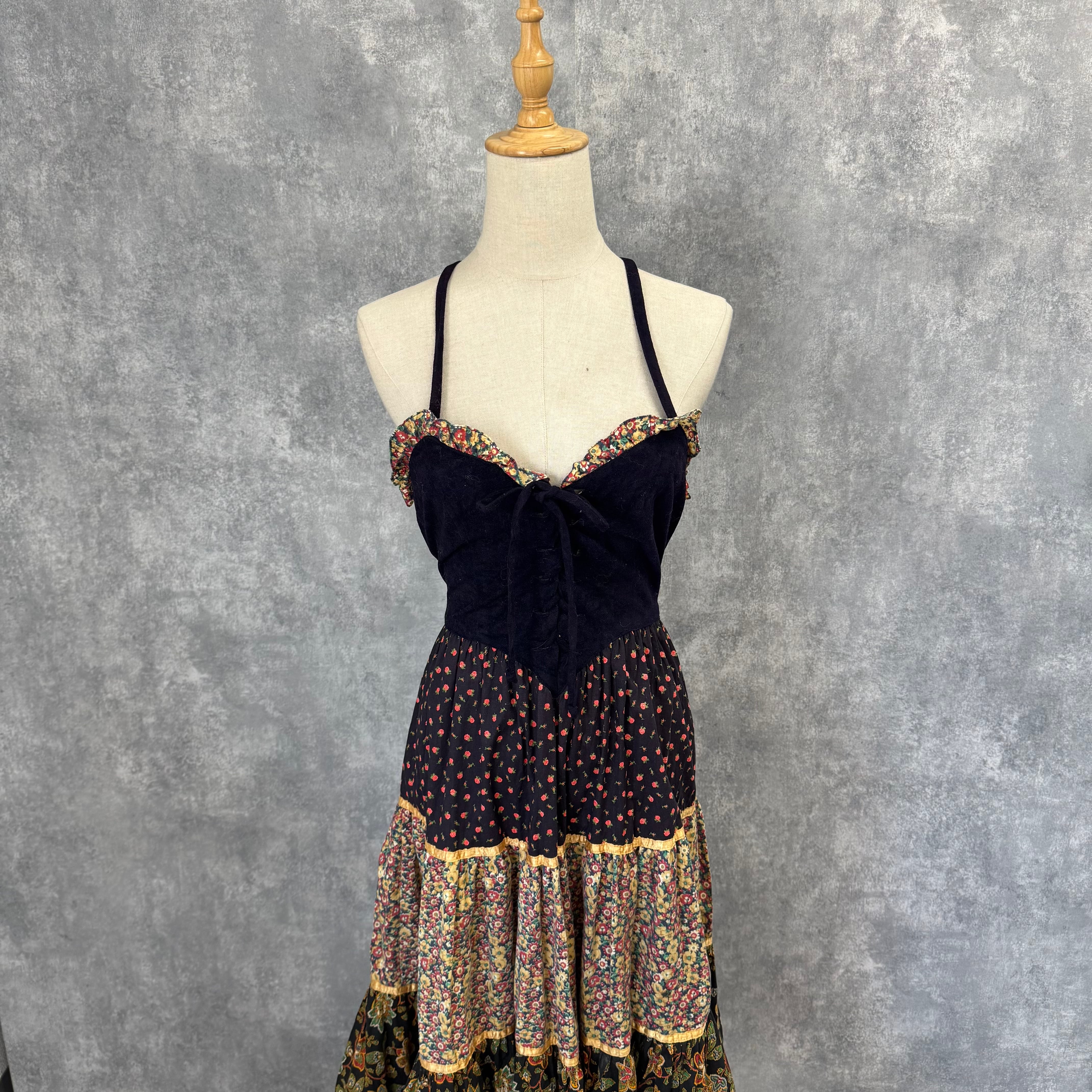 胸元のレースアップデザインとクロスバックストラップが印象的なヴィンテージドレス。