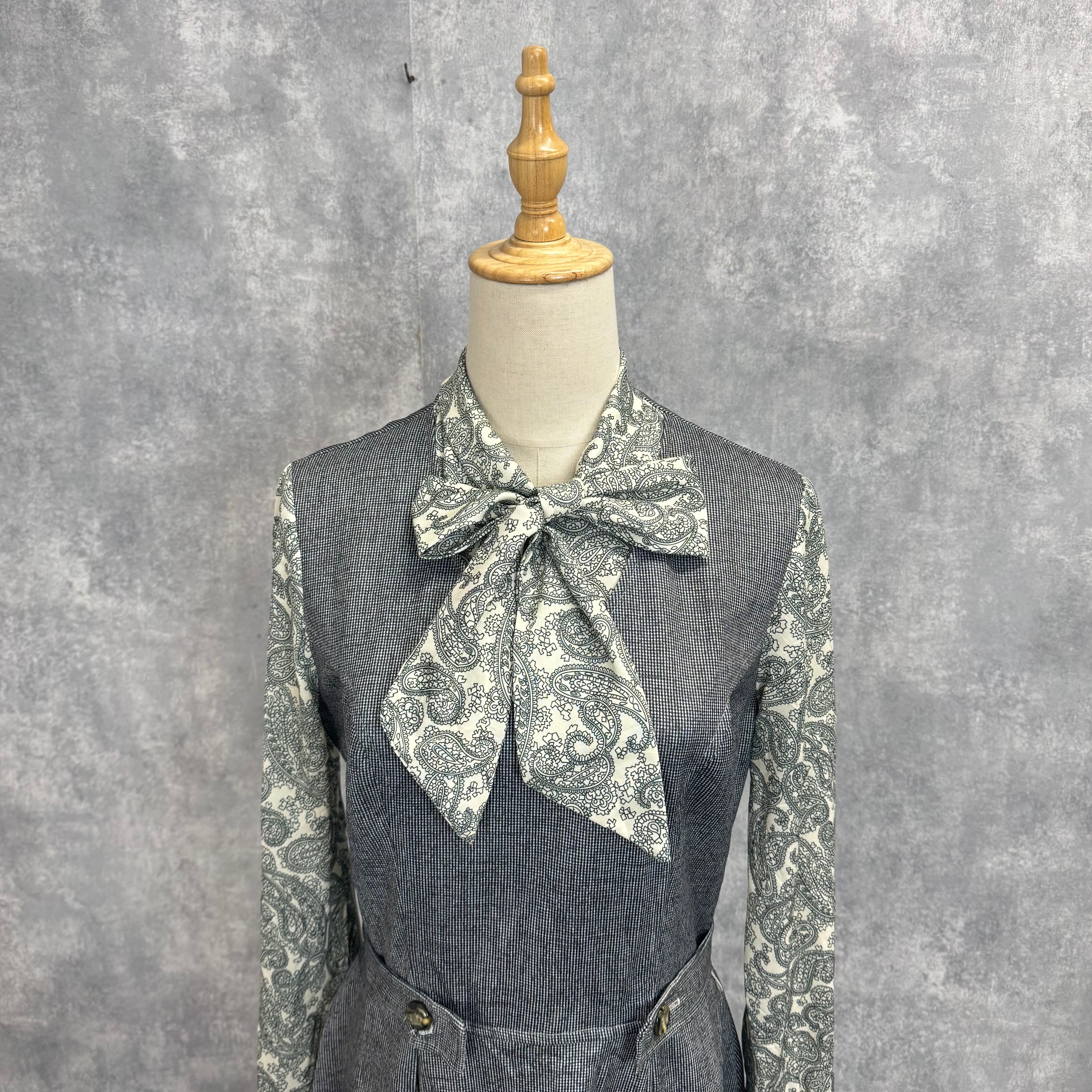 クラシカルリボンタイ×チェックジャンパースカート ペイズリーブラウスドッキングヴィンテージワンピース