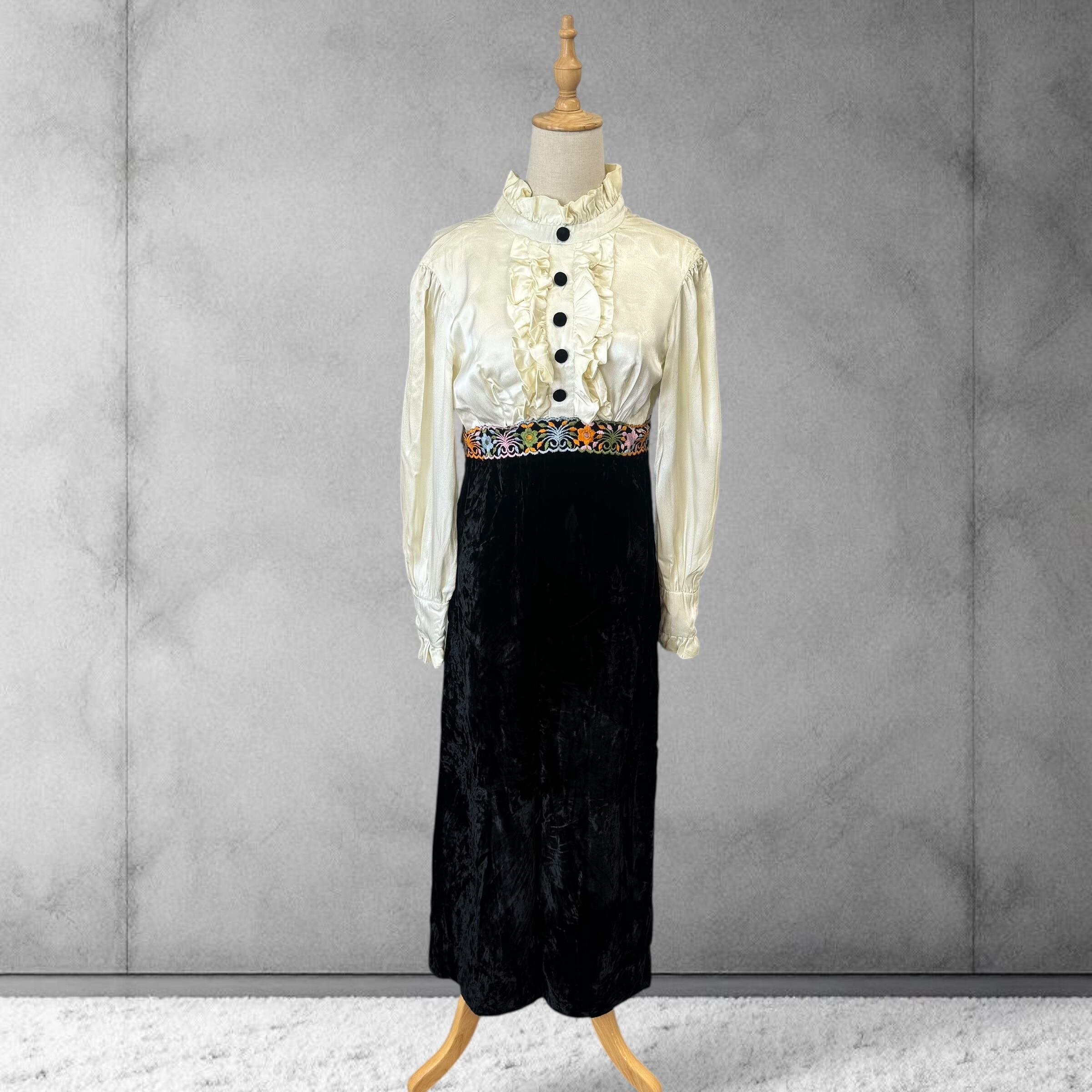 フリルハイネック×刺繍ベルト切替 ヴィンテージワンピース クラシカルアイボリー×ブラック