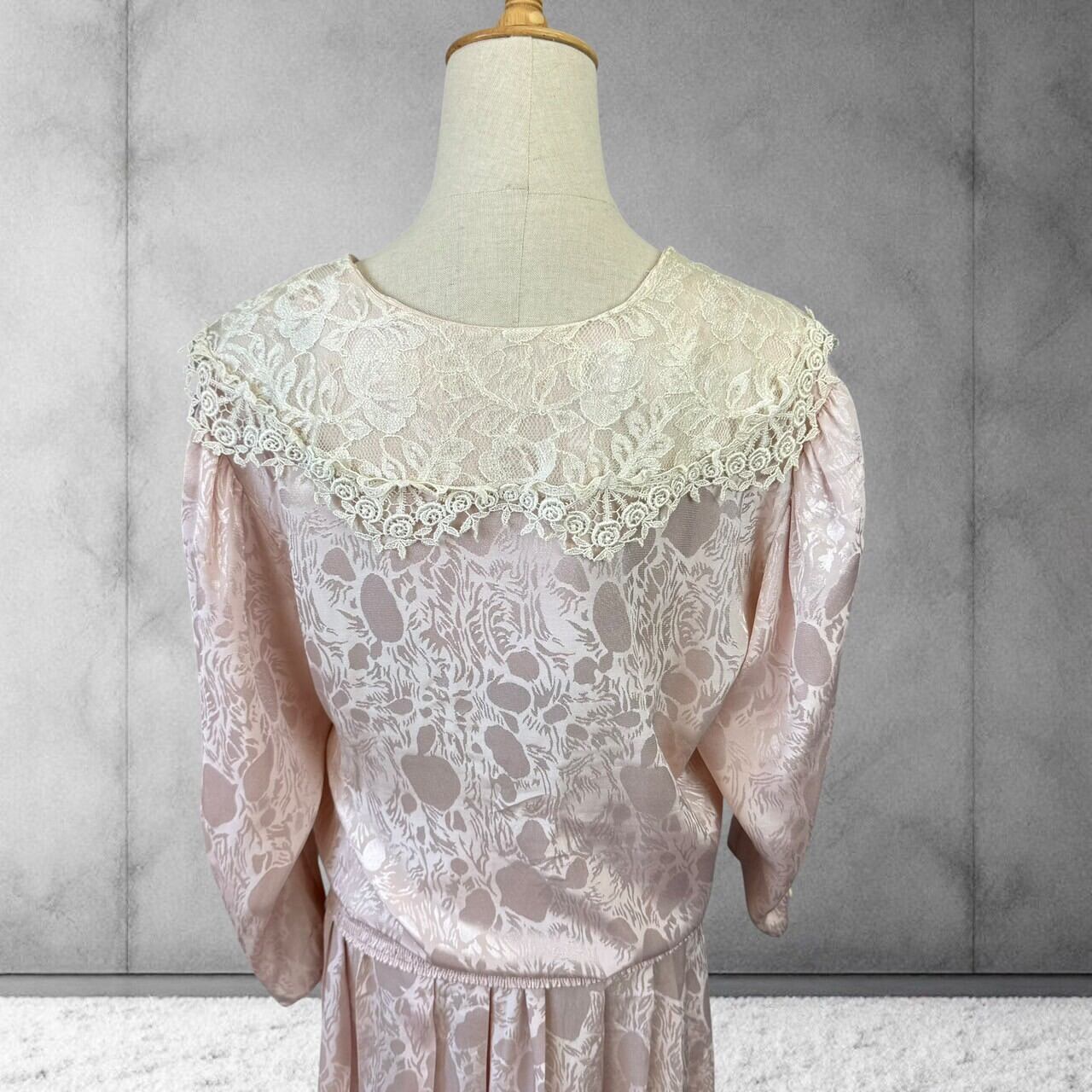 淡いピンクの光沢ある生地にレースが重なり、華やかさと可憐さを併せ持つ一着です。